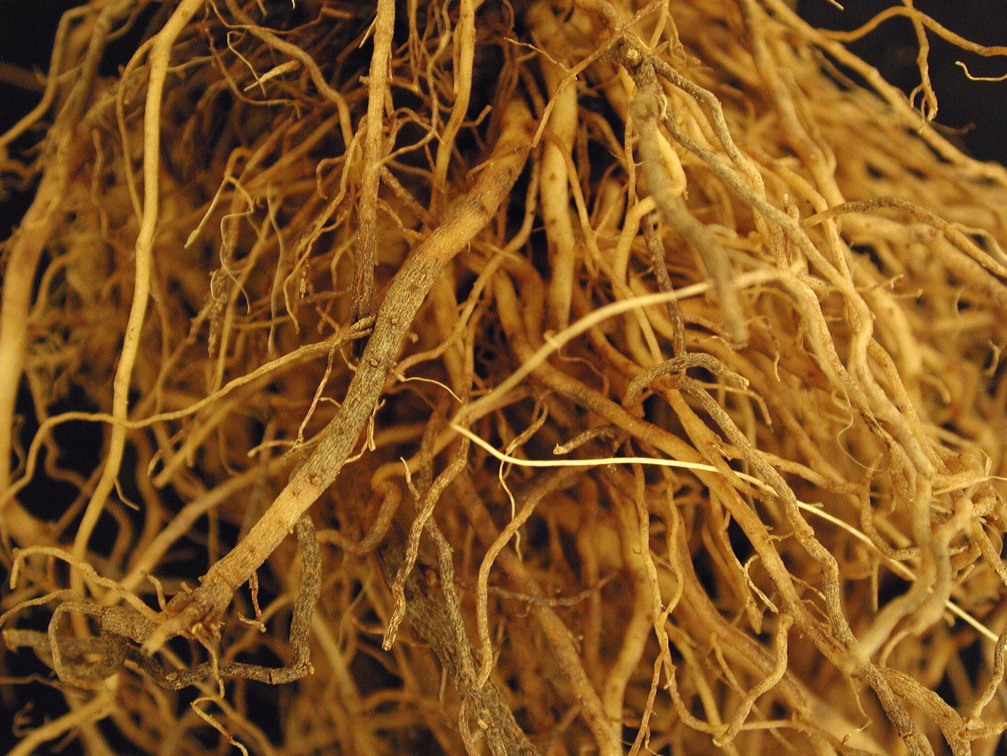 Une vue rapprochée des racines montre un cortex renflé, brun qui apparait comme un manchon liégeux sec sur de longues sections des racines. Les observations microscopiques ont révélé la présence du champignon Pyrenochaeta lycopersici, responsable de la racine liégeuse chez la tomate.