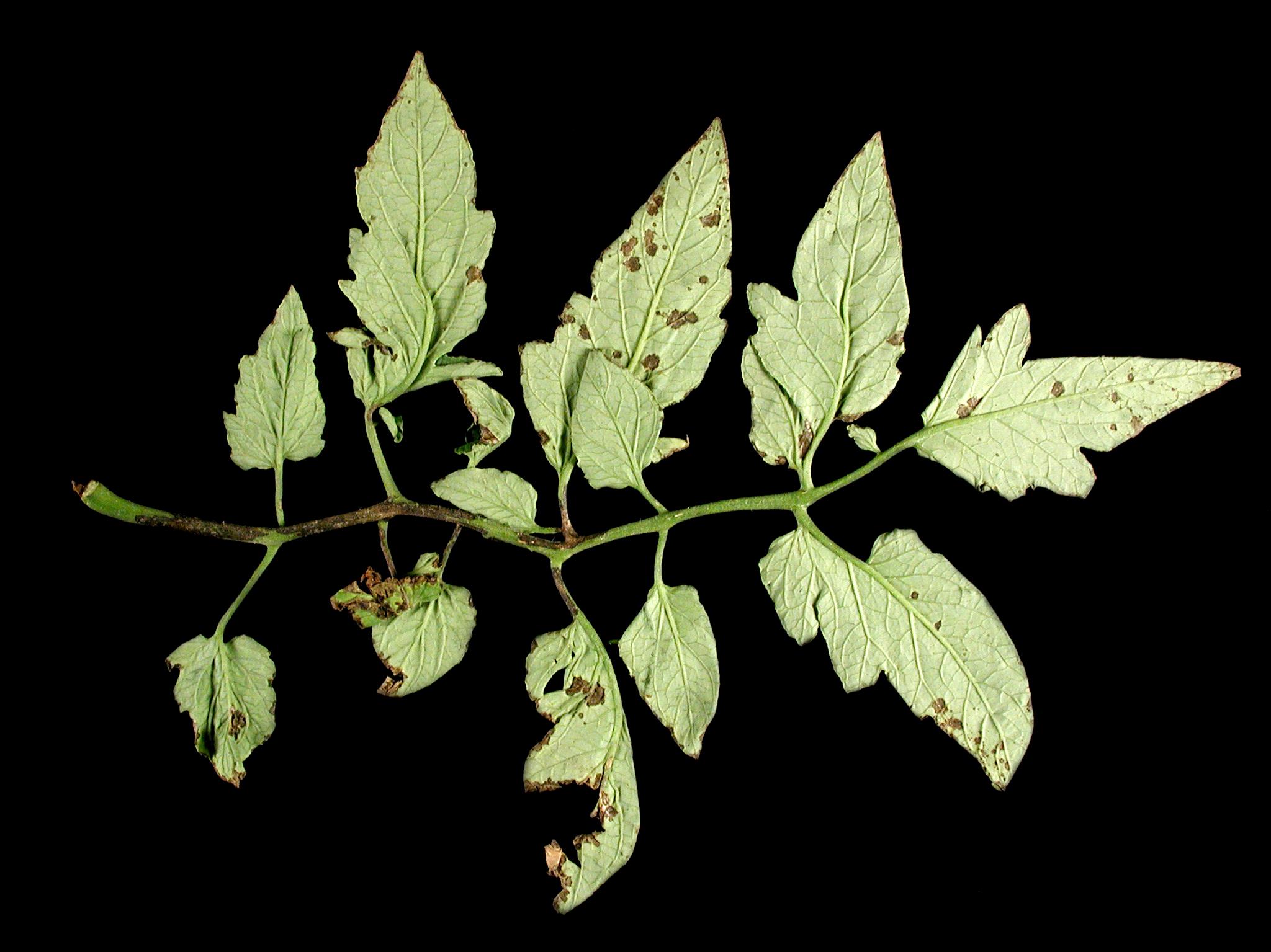 Le pétiole d’une feuille de tomate de serre montre des plages ou brûlures irrégulières brunes sur l’épiderme. Les brûlures sont superficielles. À la face inférieure de quelques folioles, présence de taches circulaires brunes mesurant quelques millimètres de diamètre. Il y a entre 5 et 15 taches par foliole. Une fine marge nécrotique est aussi visible. Les tests de laboratoire ont révélé la présence de la bactérie Pseudomonas syringae, responsable de la moucheture bactérienne chez la tomate.