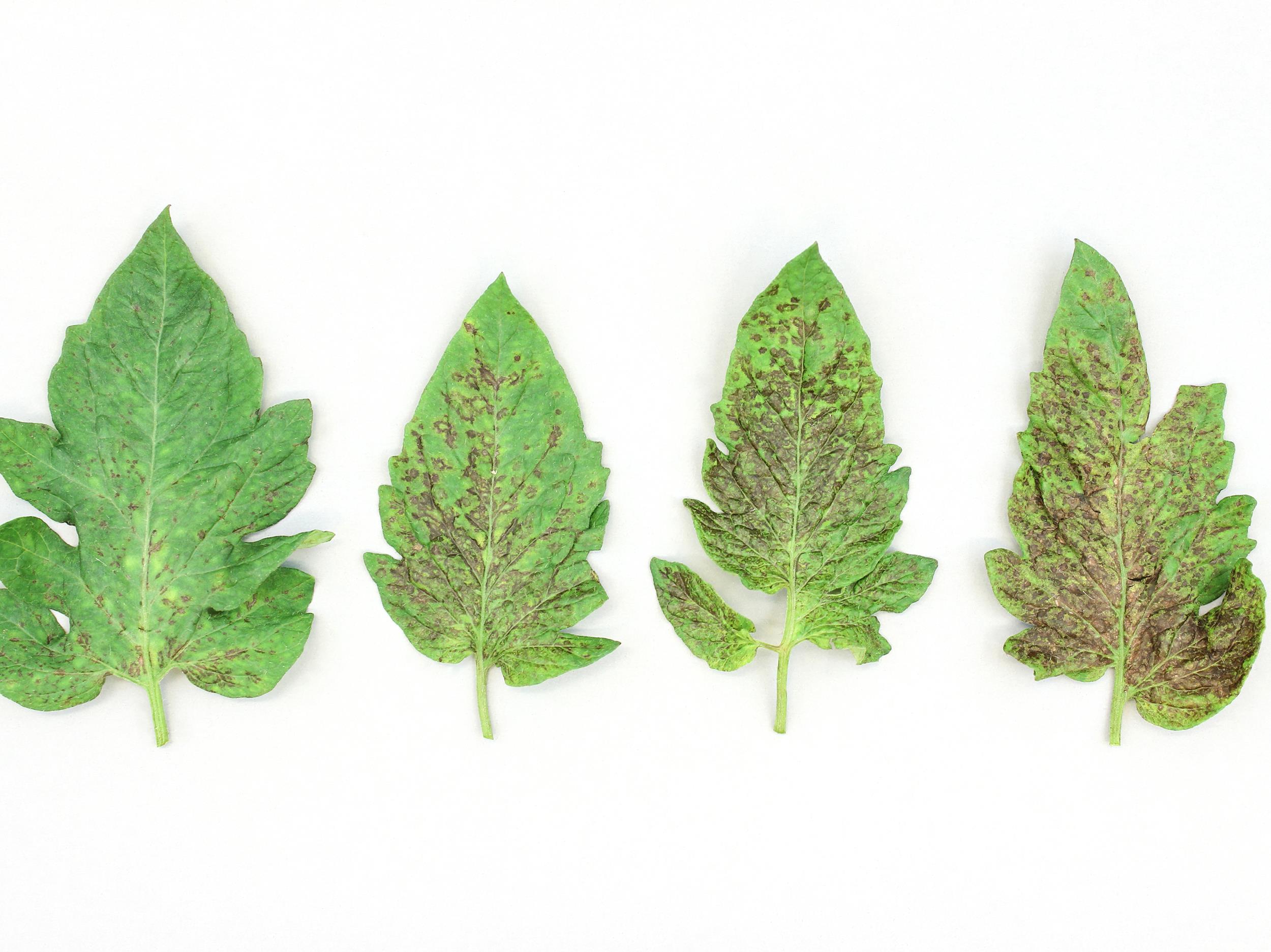 Des folioles de tomate de serre (cv 'Makari') montrent une progression de la maladie. Certaines folioles ont peu ou un niveau moyen de petites taches bronzées qui sont souvent réparties le long des nervures tandis que d’autres feuilles sont presque complètement couvertes de taches. Des anneaux bruns sont également présents sur certaines folioles. Les feuilles médianes et terminales sont affectées. Les tests de laboratoire ont révélé la présence du virus de la maladie bronzée de la tomate (TSWV).