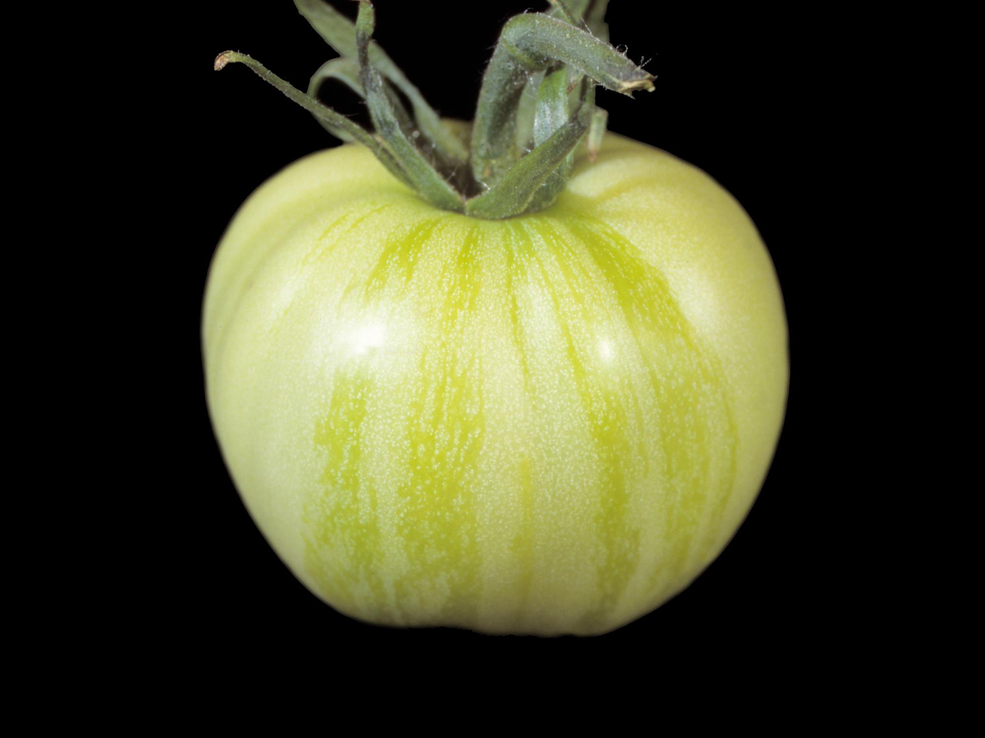 Une tomate de serre montre un épiderme avec des lignes vert jaunâtre irradiant à partir de la zone pédonculaire. La démarcation entre les tissus sains et affectés est bien délimitée. Ce symptôme est caractéristique d’un désordre génétique appelé argenture.