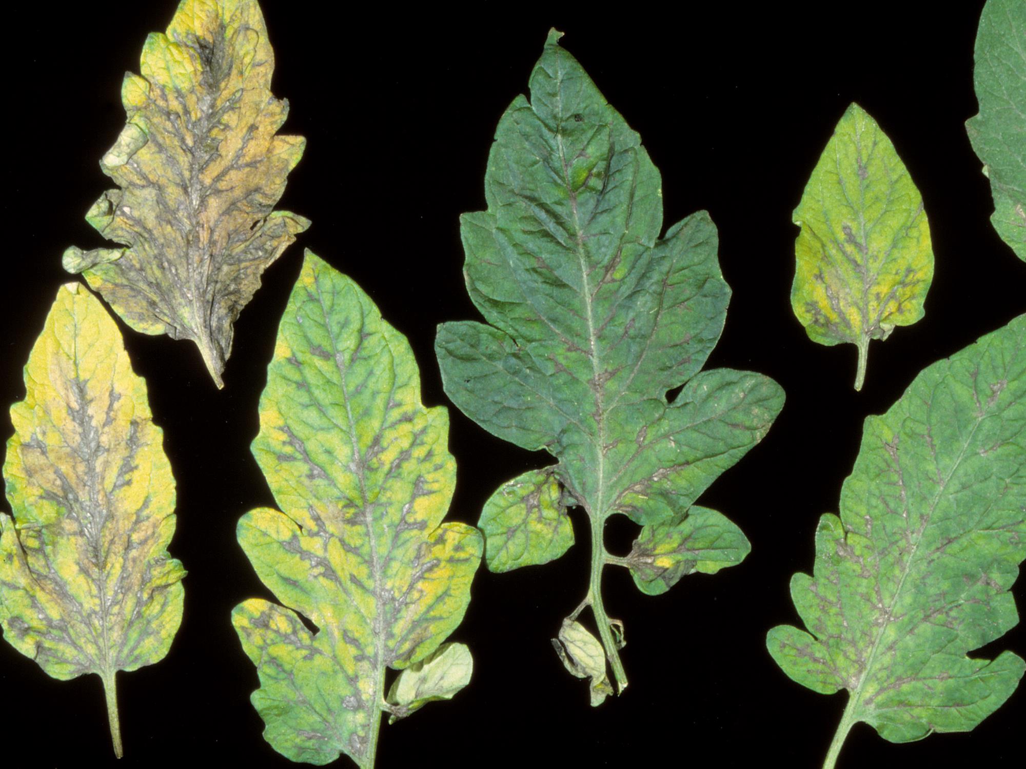 Comparaison entre différents degrés de dommage sur des folioles de tomate de serre. Les folioles présentent un brunissement localisé le long des nervures principales et parfois au niveau des nervures secondaires qui évolue ou non en de larges brûlures localisées également le long des nervures. Le brunissement est constitué d’une multitude de petites ponctuations qui sont regroupées. Un jaunissement est observé près des nervures affectées. Les symptômes sont plus sévères à la base des folioles. L’analyse minérale des tissus foliaires a révélé une toxicité en manganèse (2 228 ppm). La teneur en manganèse doit se situer entre 55 et 385 ppm. Tous les plants étaient affectés.