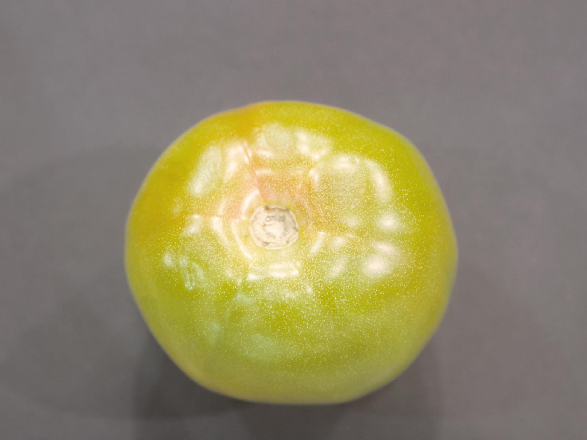 Une tomate commençant à mûrir montre dans la zone pédonculaire et à l’épaule du fruit, la présence d’une multitude de petites taches blanches. Chez la tomate, ce symptôme est caractéristique de la moucheture dorée, causée par un excès de calcium dans le fruit.
