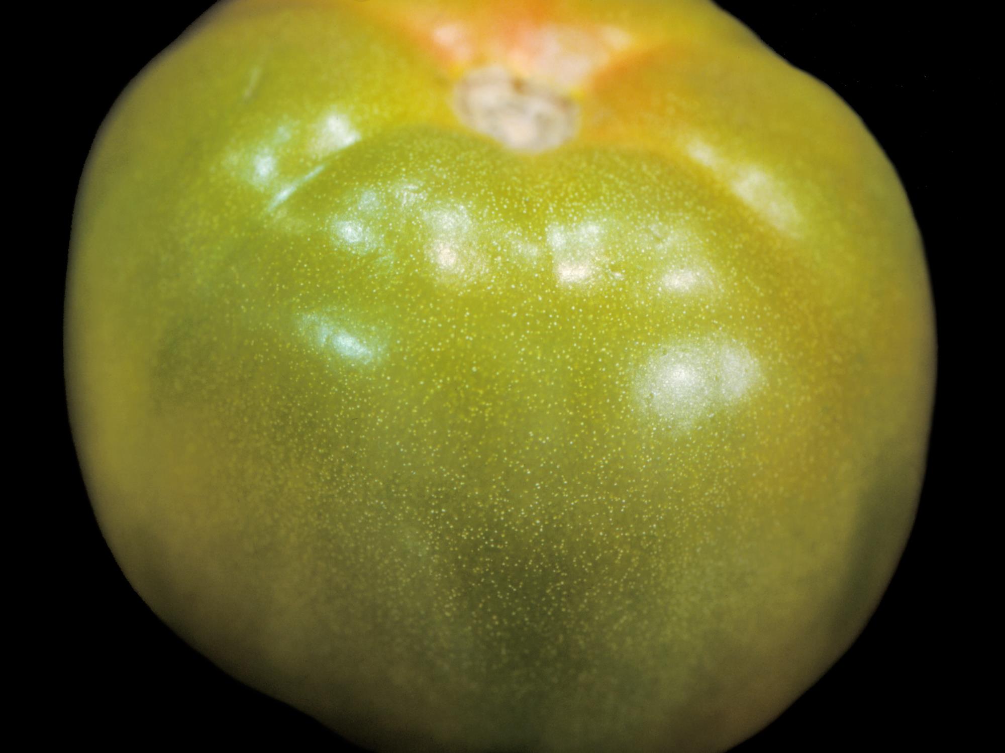 Une vue rapprochée d’une tomate commençant à mûrir montre une multitude de petites taches blanches occupant près de la moitié du fruit. Chez la tomate ce symptôme est caractéristique de la moucheture dorée, causée par un excès de calcium dans le fruit.