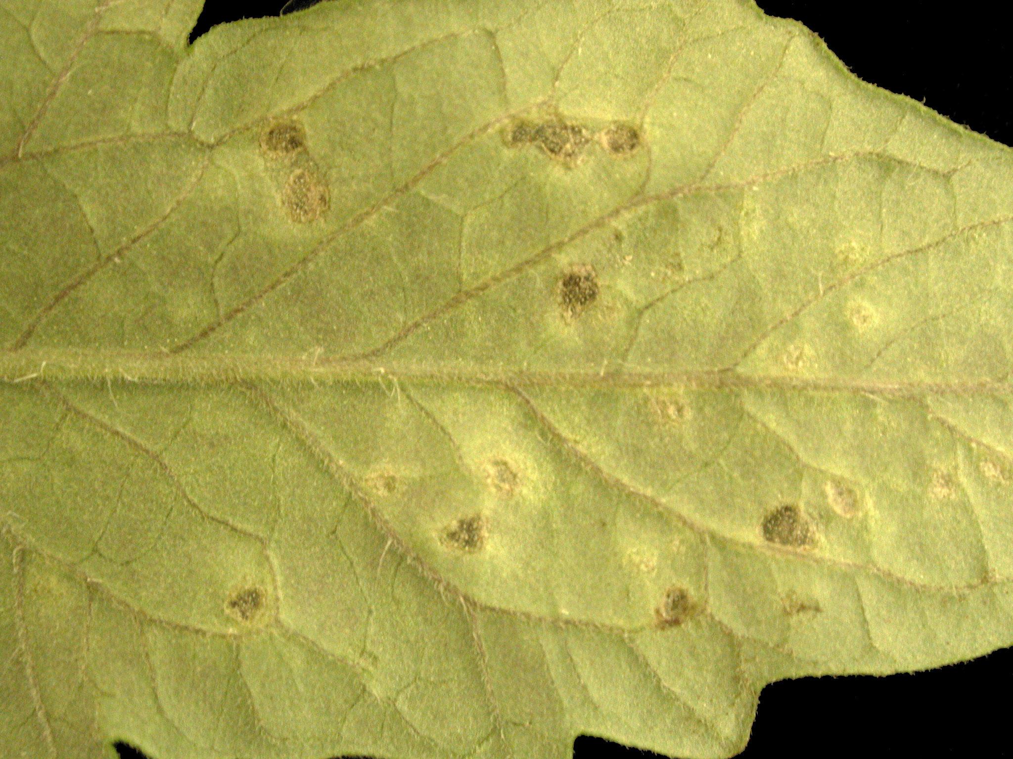 La face inférieure d’une foliole de tomate de serre permet de noter la présence de protubérances vertes qui sont devenues brunes par la suite. Les feuilles basales et médianes sont les plus affectées. Les feuilles présentaient à la face supérieure des taches circulaires ayant au début une coloration uniforme jaune dont le centre est devenu brun. Les taches pouvaient se réunir pour former des taches irrégulières ayant une plus grande surface ou des brûlures par la suite (non visible ici). Ces symptômes sont caractéristiques de l’œdème. Tous les plants de la serre étaient porteurs de ces symptômes.