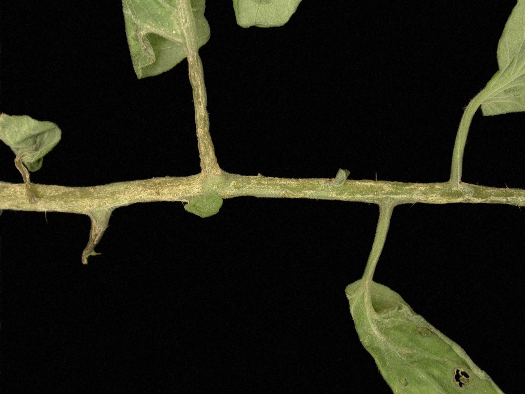 Un pétiole de feuille et une tige de tomate de serre montrent une structure blanche d’apparence duveteuse sur l’épiderme. La face inférieure des feuilles montrait des nervures avec des protubérances blanches (non visible ici). Les observations microscopiques ont révélé la présence de cellules éclatées de la plante au niveau des protubérances et de la structure blanche. Ces symptômes sont caractéristiques de l’œdème. Tous les plants de la serre étaient porteurs de ces symptômes.