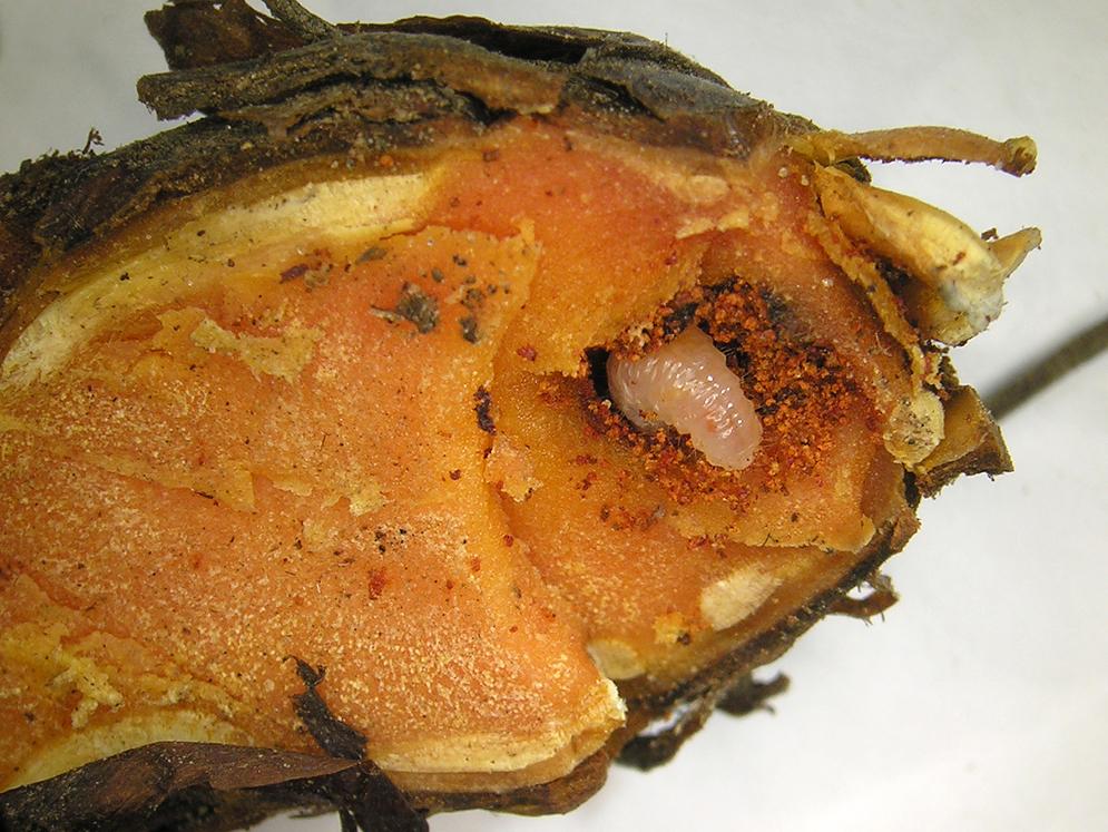 Coupe transversale du collet d'un plant de fraisiers avec une larve de charançon noir de la vigne dans sa galerie.
