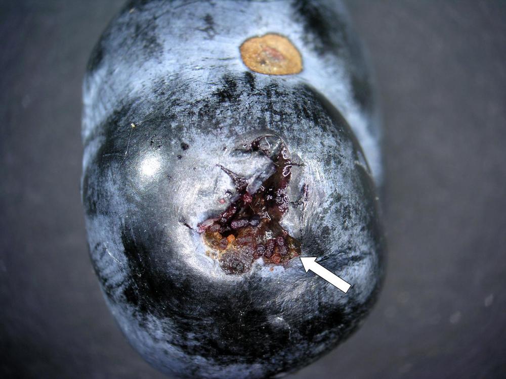 Bleuet présentant un trou en surface qui se prolonge en galerie dans la chair. Des excréments sont visibles. Plusieurs espèces sont susceptibles de causer ce type de dommages, notamment les tordeuses Grapholita packardi et Grapholita prunivora.