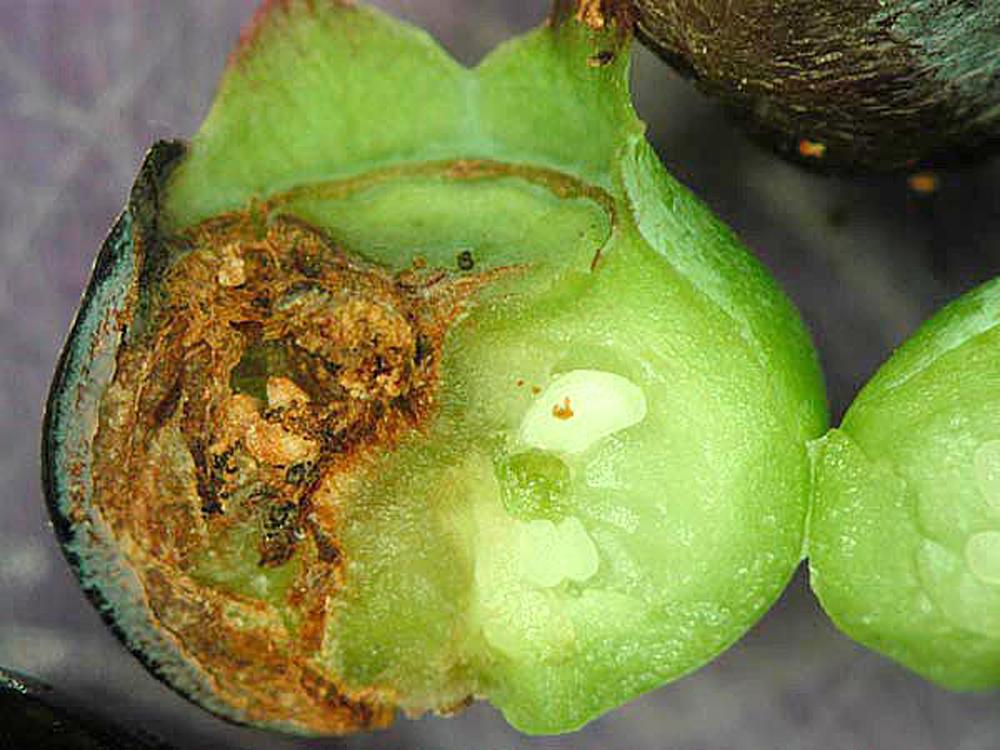 Coupe médiane d'un bleuet présentant une galerie causée par la pyrale des atocas. La femelle pond ses oeufs individuellement sous les lobes du fruit. La jeune larve perce un trou, pénètre dans le fruit et ferme le trou avec de la soie. Plus âgée, elle laisse le trou béant, y rejetant souvent des excréments. Les larves se développent principalement dans les fruits verts et s'alimentent presque de la totalité du fruit. Les fruits attaqués mûrissent prématurément. Une larve peut consommer de trois à six fruits pendant son développement larvaire. À maturité, elle se laisse tomber au sol alors que les fruits endommagés se ratatinent et peuvent rester accrochés au pédoncule jusqu'au printemps suivant.