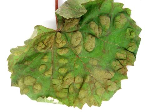 Face supérieure d'une feuille de vigne présentant des déformations causées par l'alimentation d'ériophyides de la vigne. Les dégâts se caractérisent par des boursouflures jaunâtres sur le limbe. Les ériophyides se retrouvent dans un feutrage blanchâtre sur la face inférieure de la feuille.