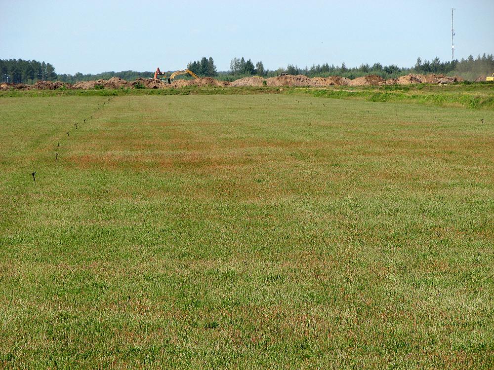 Un champ de canneberge présentant des zones où le feuillage brunâtre témoigne d'une forte activité d'altises à tête rouge. Les dégâts, causés par le grignotement des adultes, sont observables au mois d'août.