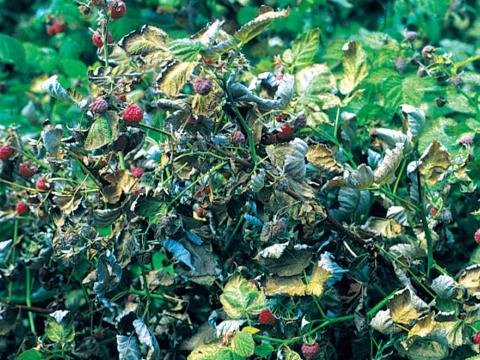 Plants de framboisiers présentant des dommages causés par l'alimentation de tétranyques de McDaniel. Les stades immatures et les adultes piquent les cellules végétales et se nourrissent de leur contenu, entraînant de petits points jaunâtres ou de zones de décoloration localisées. Les feuilles sévèrement endommagées se dessèchent et tombent prématurément. Lors de fortes infestations, il y a présence de toiles.