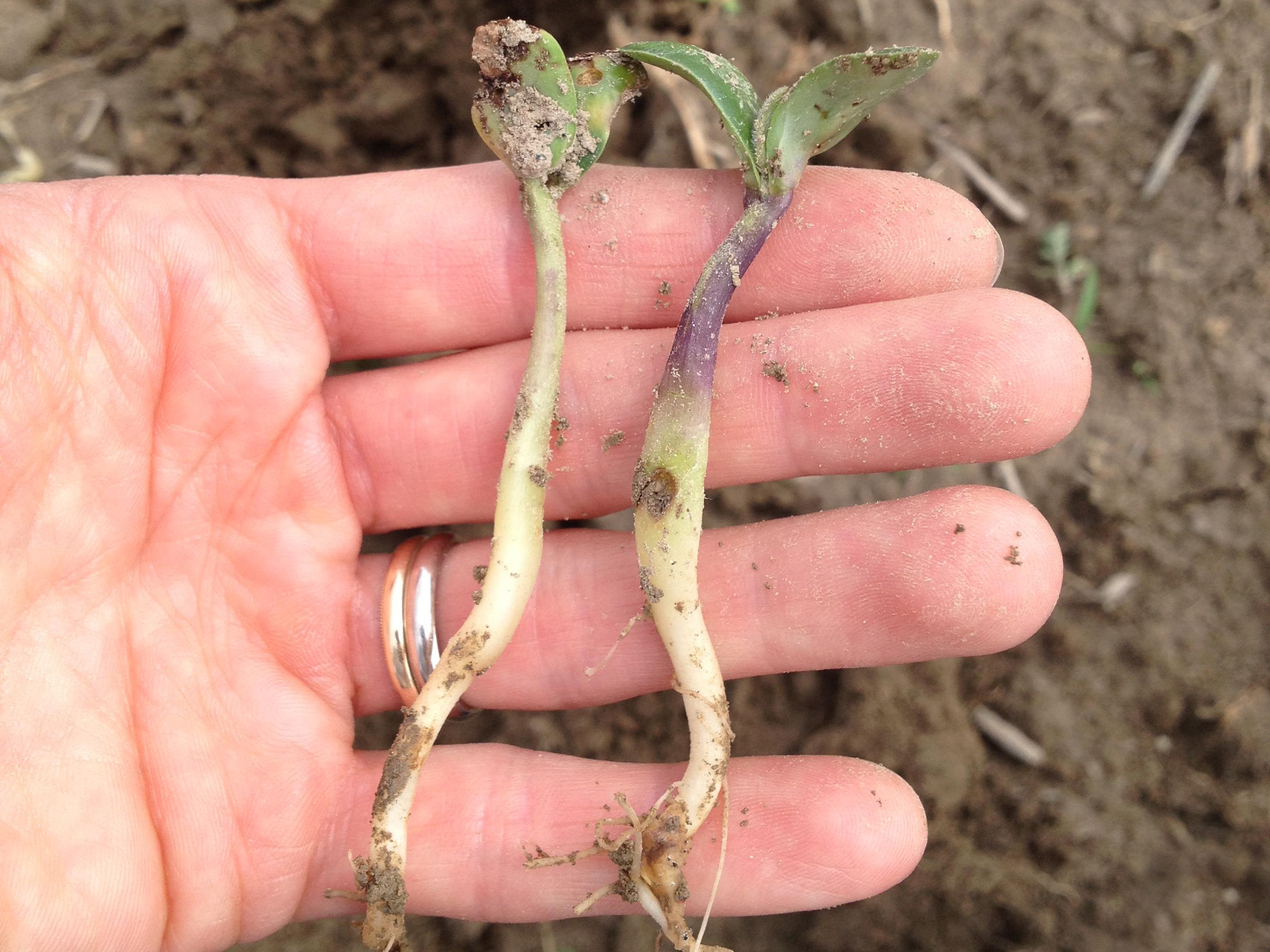 Plantule de soya présentant des dommages causés par la mouche des semis : les cotylédons ont été broutés, les zones affectées sont irrégulières et des petits trous sont visibles.