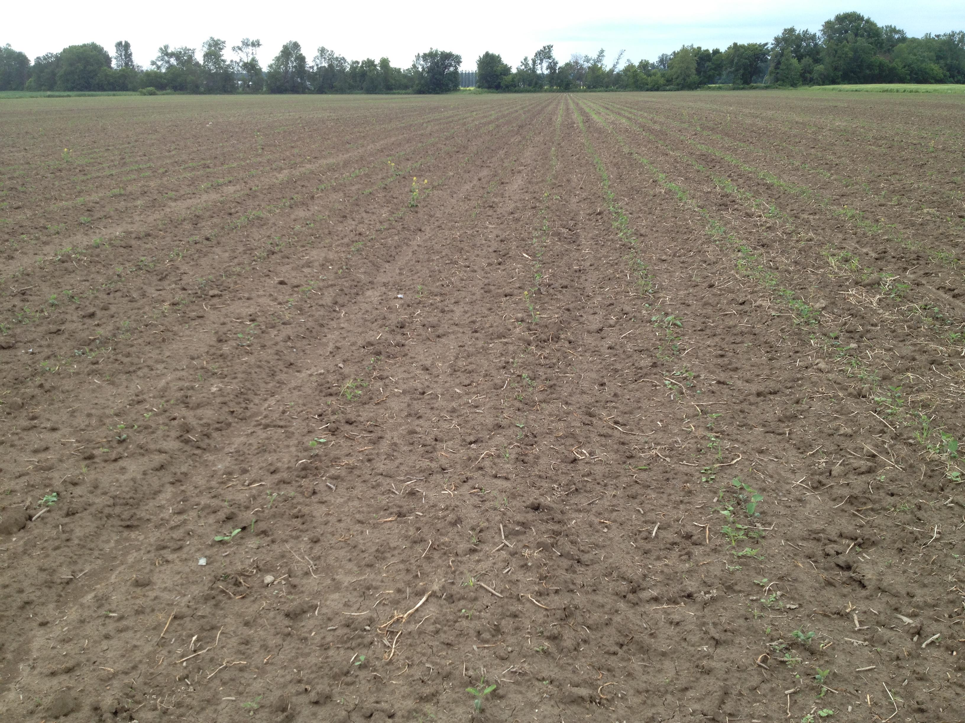 Un champ fortement affecté par la présence de la mouche des semis. Un grand nombre de plants n'a pas levé car la semence a été consommée avant même d'avoir pu germer.