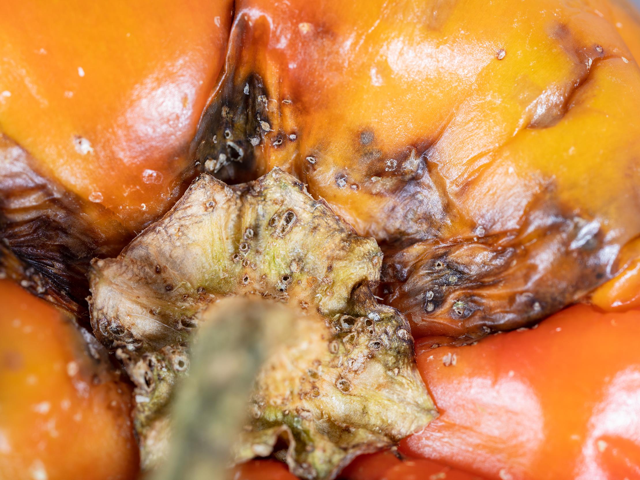 Un poivron présentant d'importants dommages causés par le charançon du poivron (Anthonomus eugenii). Les adultes de cette espèce creusent de petits trous pour s'alimenter et pour pondre leurs oeufs. Le développement des larves à l'intérieur des poivrons cause une nécrose ainsi qu'un pourrissement des tissus, qui deviennent bruns.