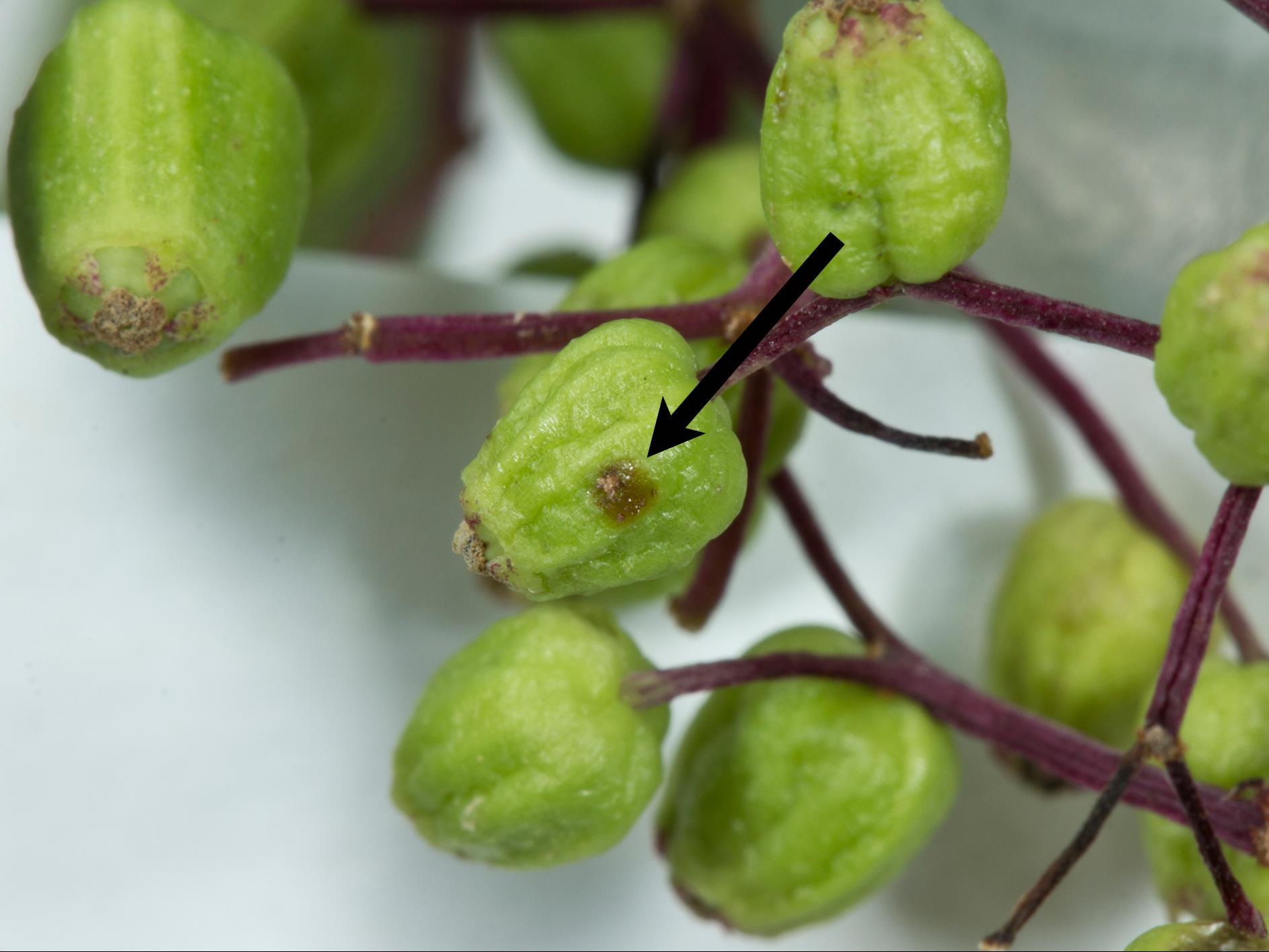 Symptôme de piqûre de la punaise Neurocolpus jessiae : les enzymes digestives injectées dans le fruit, lorsque la punaise s'alimente, induisent une nécrose aux tissus qui tendent à brunir.