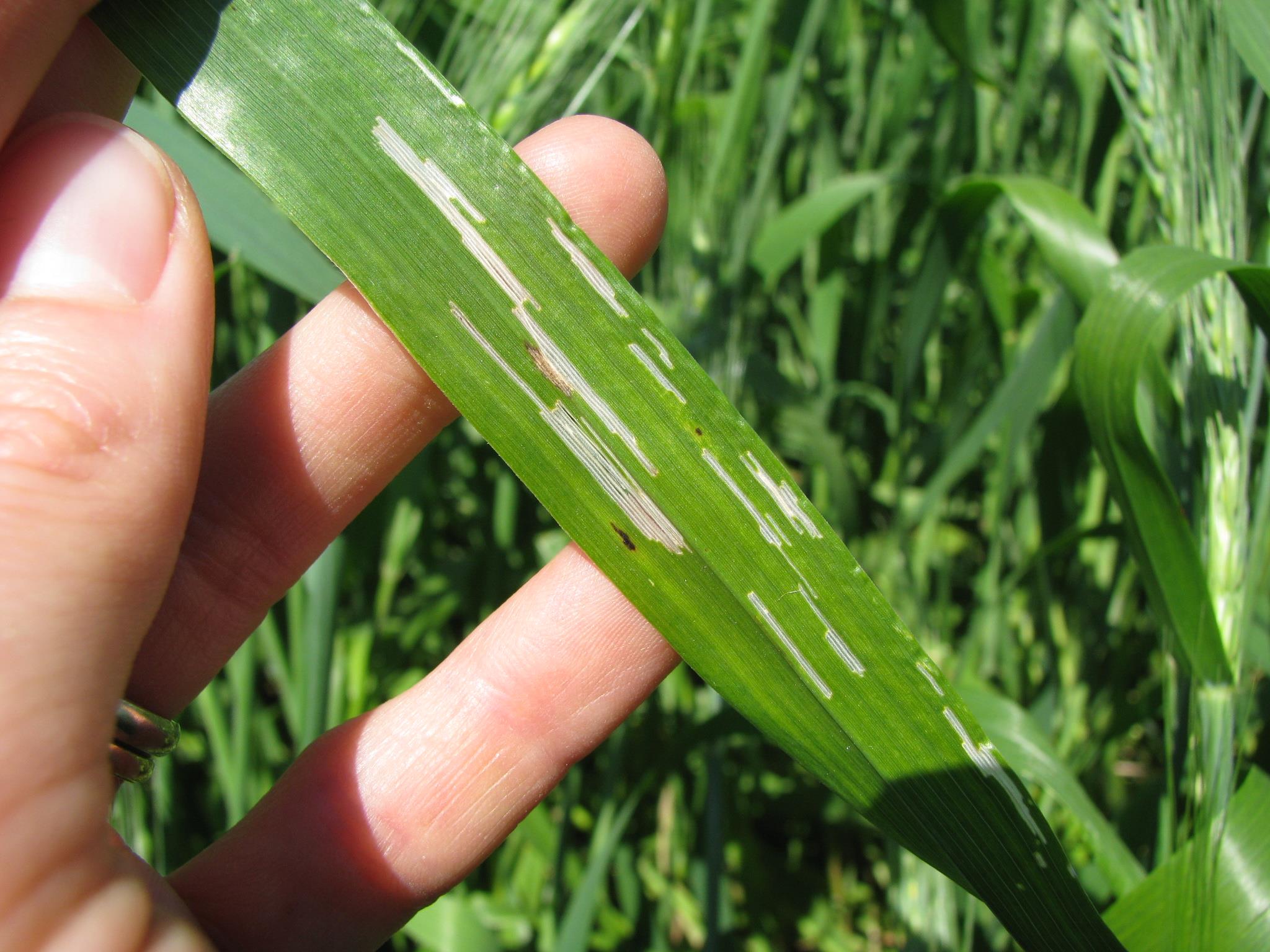 Feuille de blé présentant des dommages causés par la larve du criocère des céréales : les larves grignotent de longues bandes longitudinales entre les nervures sur la face supérieure des feuilles, ne laissant que les tissus transparents de la face inférieure des feuilles.