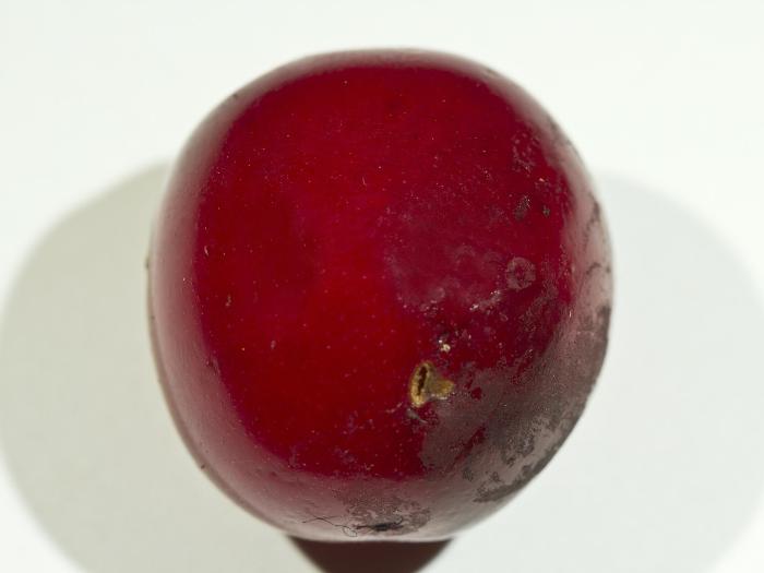Plusieurs cerises présentant différents symptômes causés par le charançon de la prune : les cerises dans lesquelles des larves se sont développées avec succès présentent divers niveaux de déformation. Certains fruits pourrissent prématurément tandis que d'autres vont présenter des anomalies de coloration et un fendillement au niveau de la pelure. Une forte proportion des fruits affectés tombe avant d'avoir atteint la maturité.