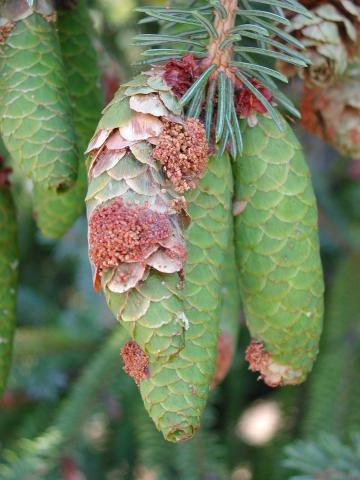 Dommages de la pyrale des cônes de sapin sur des cônes d'épinette. On peut apercevoir des excréments granuleux et rougeâtres à la surface du cône ainsi que de la soie blanche qui a été tissée par les larves présentes à l'intérieur du cône.