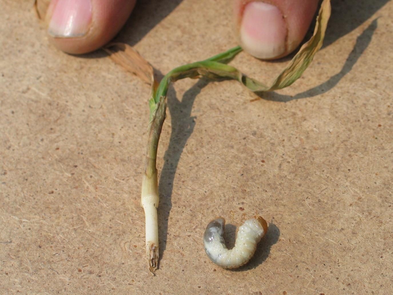 Dommages causés par un ver blanc sur un plant de maïs