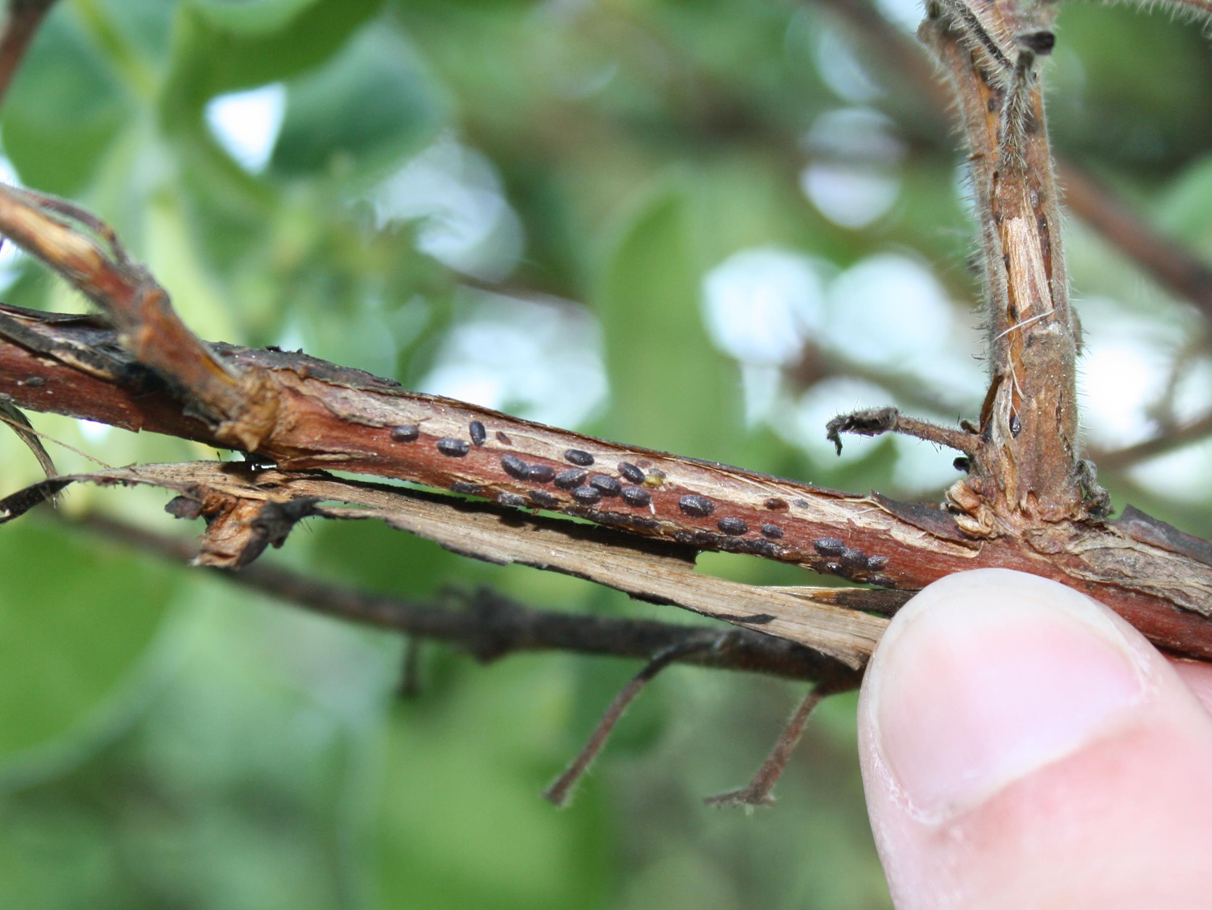 Colonie de cochenilles sous l'écorce d'un camérisier