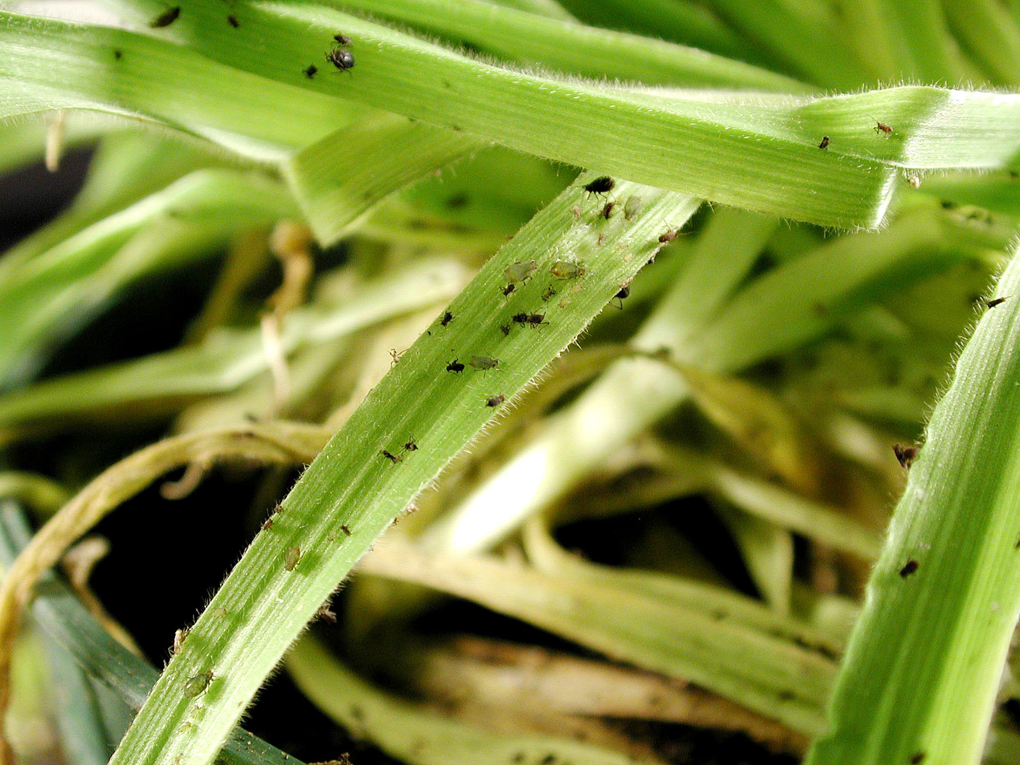 Colonie de pucerons sur feuillage de graminée