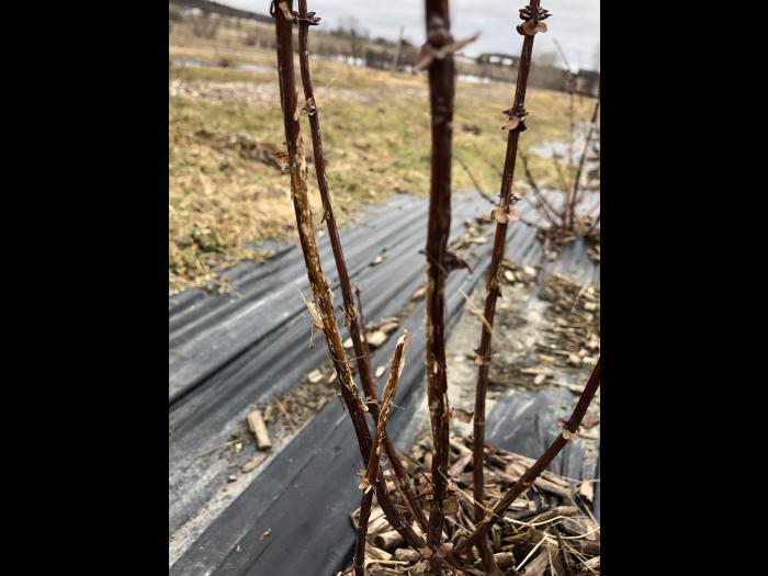 Dommages de campagnol sur les tiges d'un camérisier.