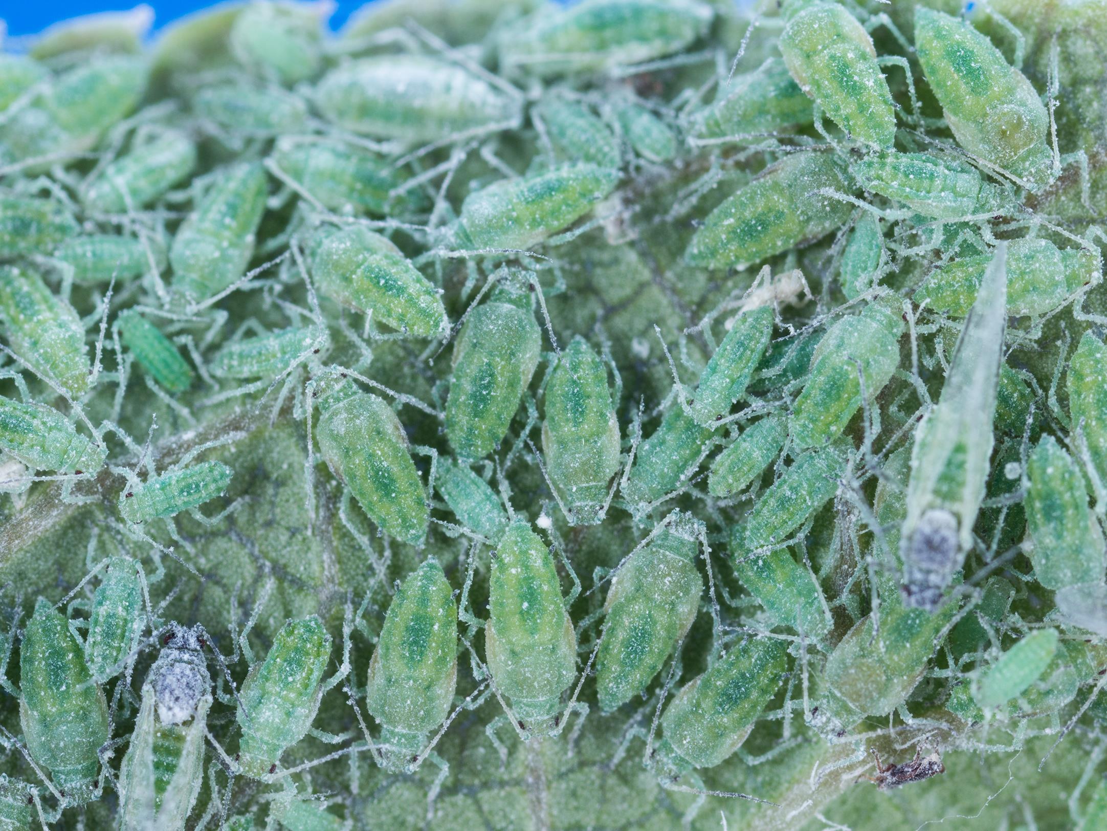 Colonie de pucerons sur une feuille de prunier