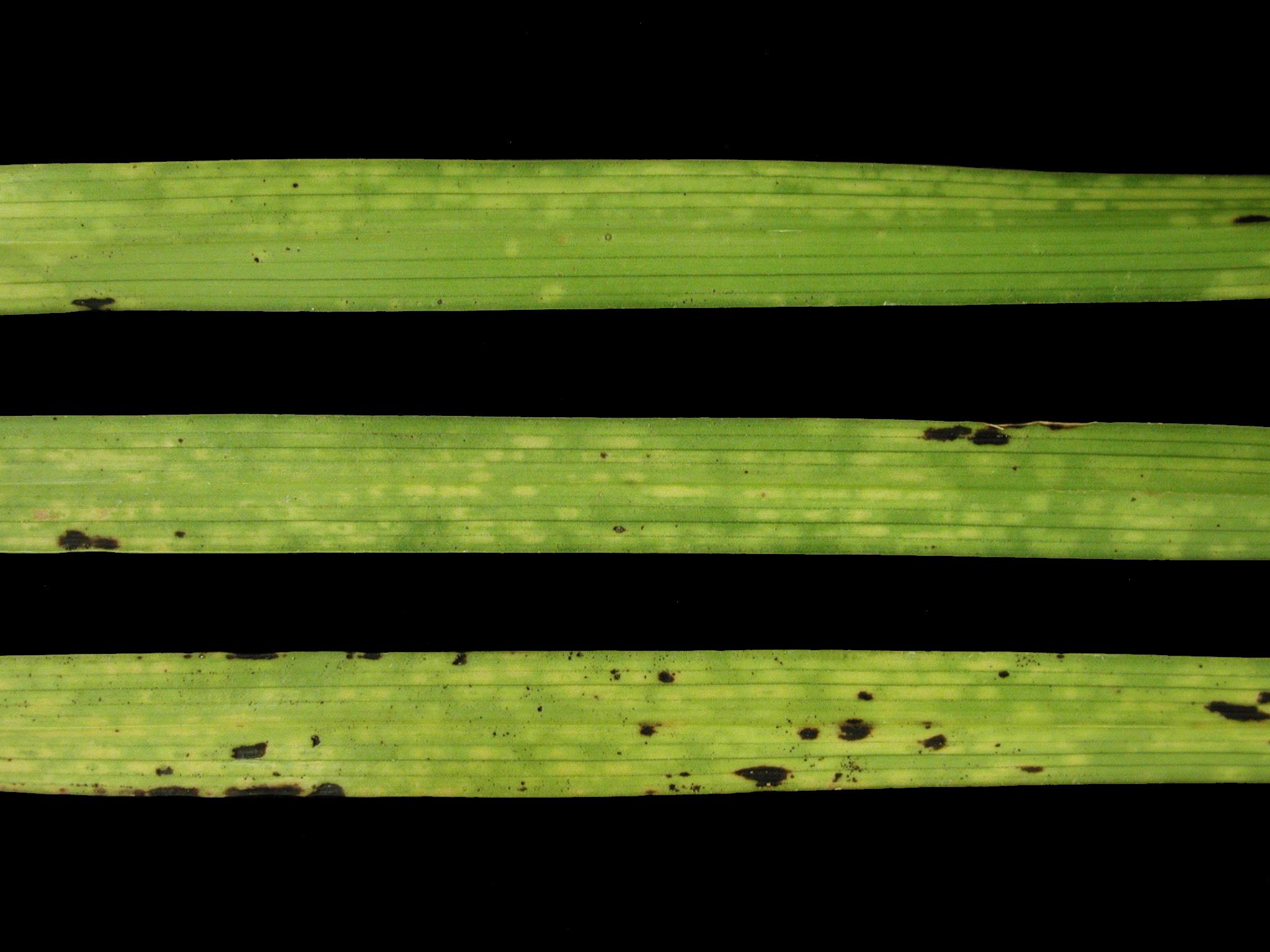 Des feuilles d’orchidée Cymbidium montrent des taches jaunes à vert pâle, parfois translucides, et densément distribuées le long des nervures. Ces taches mesurent 1 à 2 mm de diamètre. Des taches noires ovoïdes sont également observées. Tous les niveaux de feuille étaient touchés. Les tests de laboratoire ont révélé la présence du virus de la mosaïque du cymbidium (CyMV).