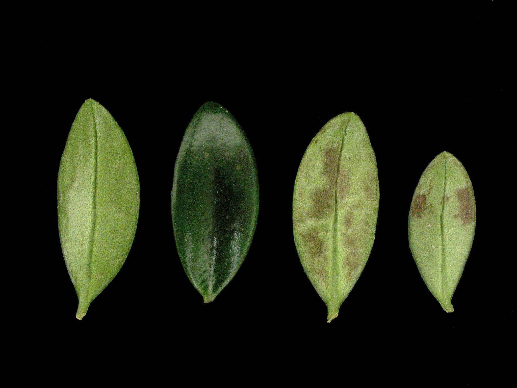 Comparaison entre une feuille saine et trois feuilles affectées d’une aeschynanthe (plante rouge à lèvres). Les feuilles affectées montrent des taches irrégulières brunes à la face inférieure (extrême gauche) et une grande tache brune à noire à la face supérieure. Les tests de laboratoire ont révélé la présence du virus de la mosaïque de la tomate (ToMV).