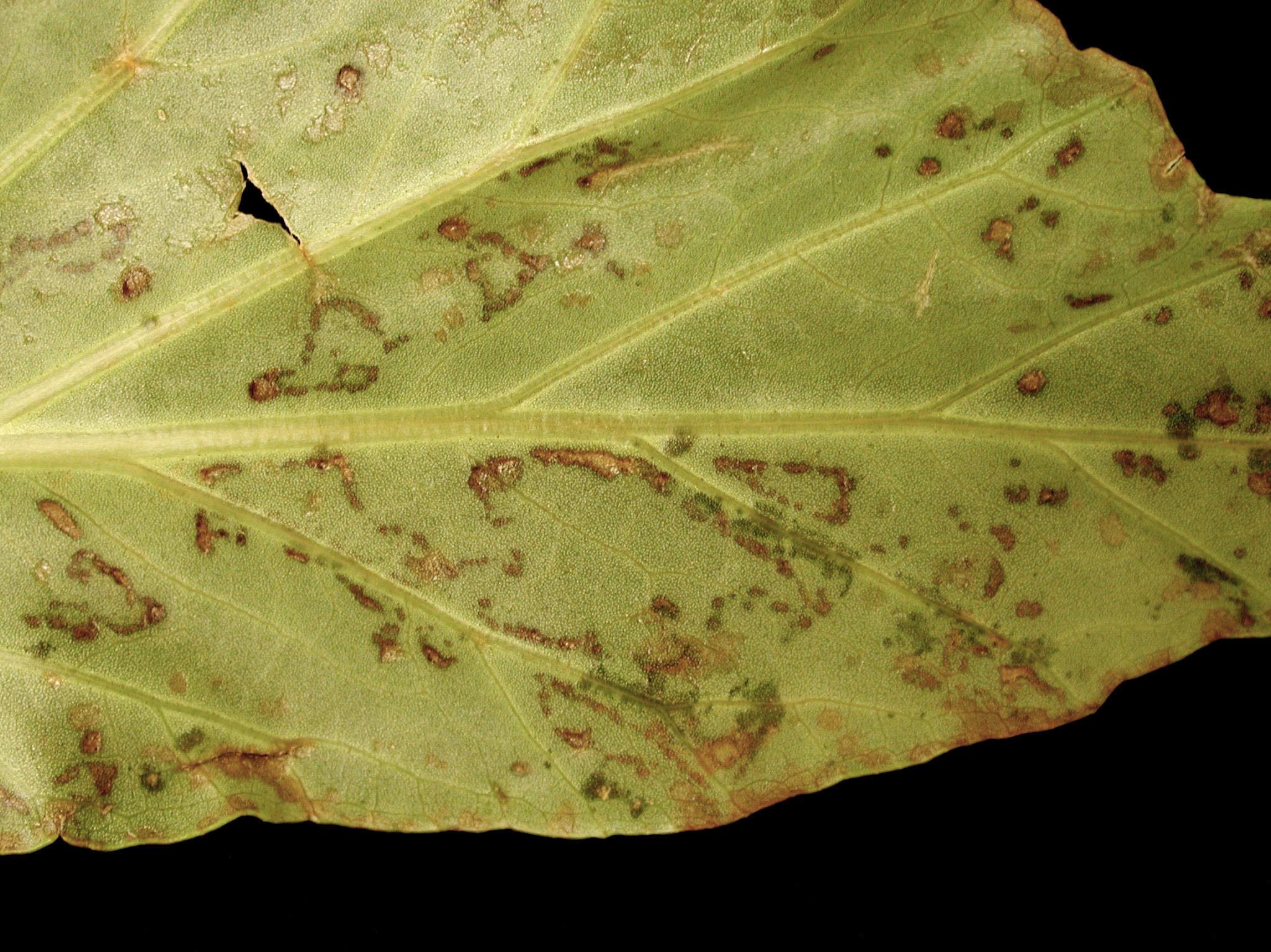 Une vue rapprochée de la face inférieure d’une feuille de bégonia dichroa cultivé en serre montre la présence de taches avec un large halo brun foncé, d’aspect liégeux. Les taches longent régulièrement les nervures ou sont situées entre celles-ci. Chaque tache à la face inférieure se trouve vis-à-vis une tache à la face supérieure. Les tests de laboratoire ont révélé la présence d’un virus appartenant au groupe des Potyvirus.
