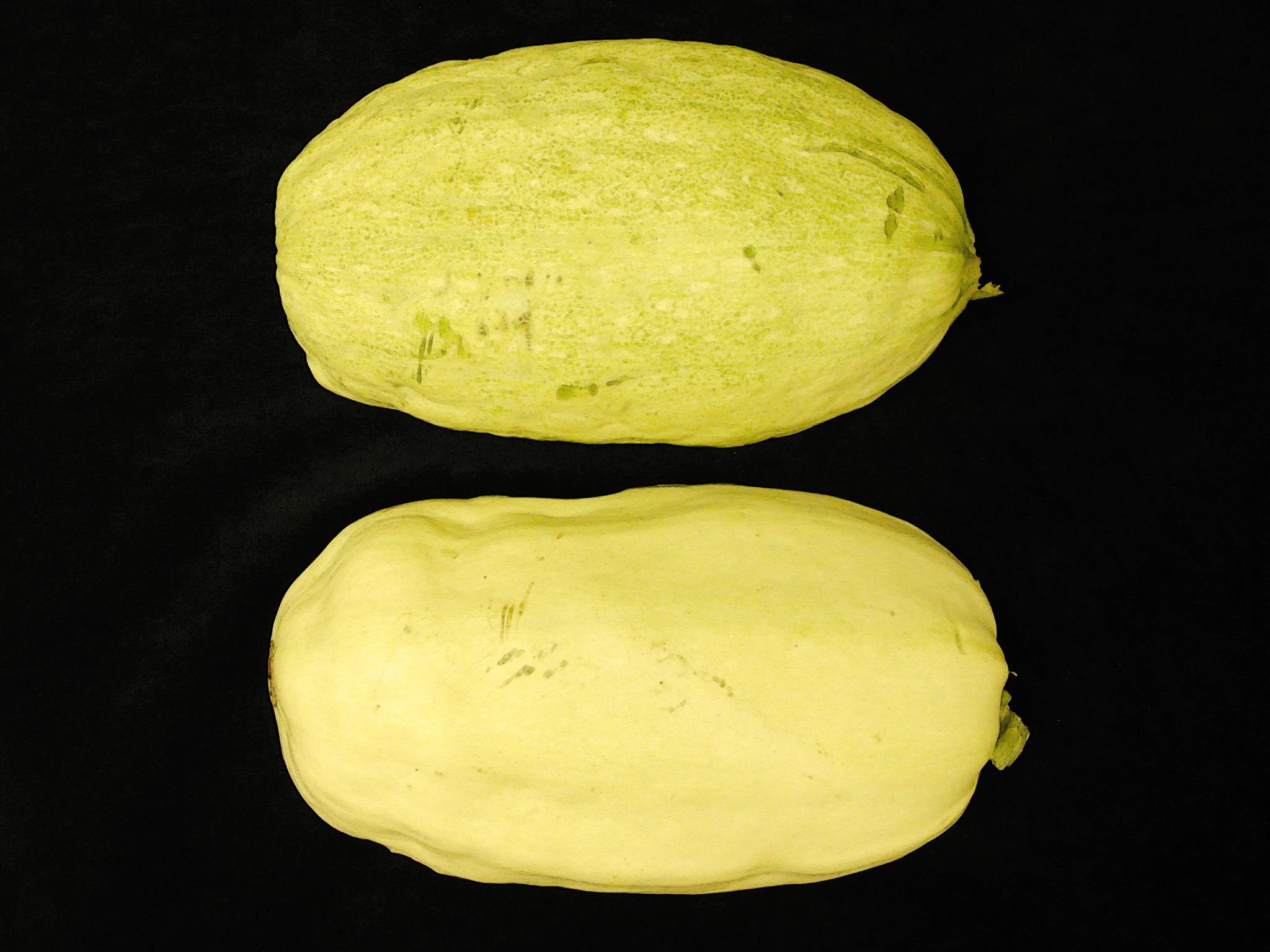 Sur des courges spaghetti, présence d’un bossellement sur toute la surface de l’épiderme des fruits. Le fruit du haut montre également un fin réseau réticulé vert à la surface de l’épiderme. La chair est intacte (non visible ici). Les tests de laboratoire ont révélé la présence d’un complexe viral constitué du virus de la mosaïque du concombre (CMV) et d’un virus appartenant au groupe des Potyvirus. La conseillère agricole mentionne que les symptômes sont distribués de manière éparse au champ et que 2 % des plants sont touchés.