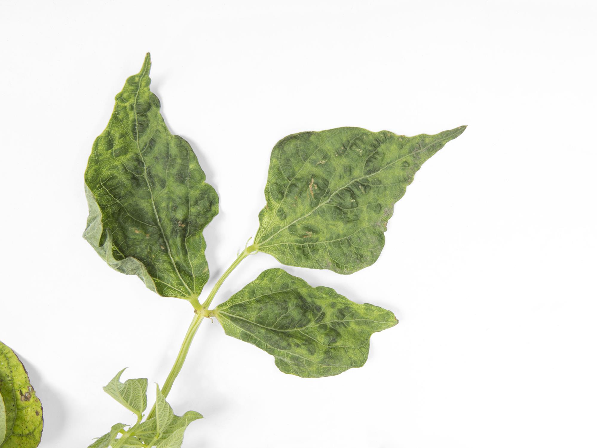 Des folioles de haricot sont déformées. Elles montrent du bossellement, une marbrure du limbe allant du vert foncé au vert pâle, les nervures sont déformées et la marge peut être courbée vers le haut. Les jeunes feuilles sont les plus affectées. Les tests de laboratoire ont révélé la présence du virus de la mosaïque du concombre (CMV).