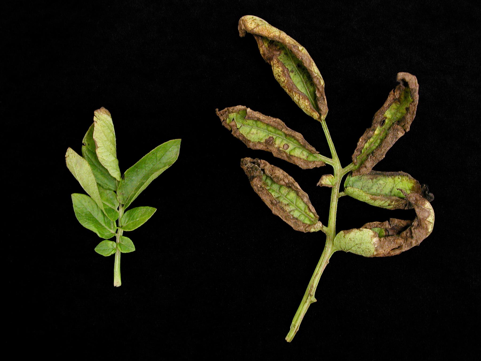 Une jeune feuille de pomme de terre (cv 'FL-1207') est très petite et repliée lorsque comparée à une feuille plus âgée qui montre des folioles avec une marge brûlée enroulée vers le haut. Les tests de laboratoire ont révélé la présence du virus de l’enroulement de la pomme de terre (Potato Leaf Roll Virus (PLRV)).