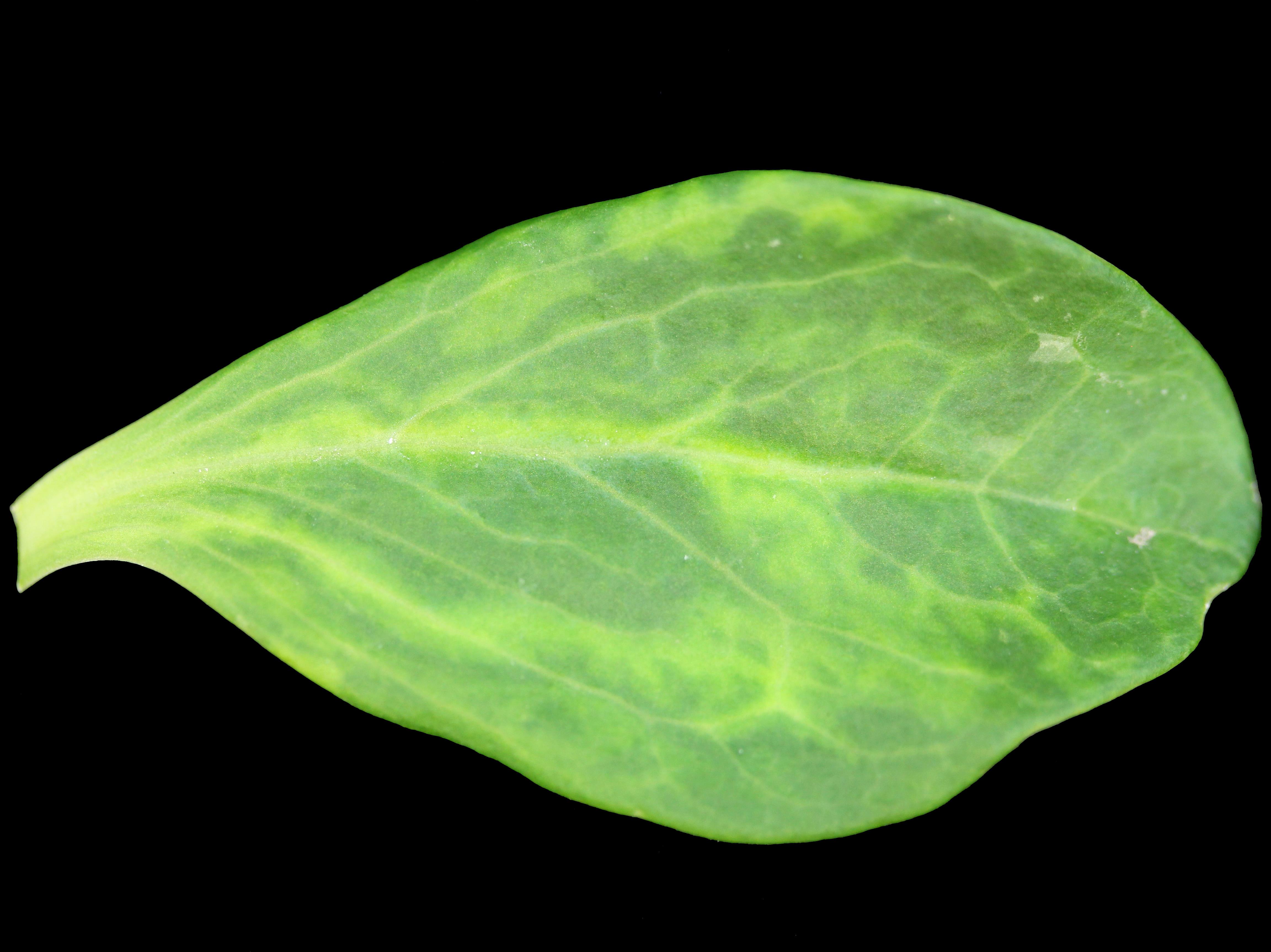 Une feuille de pachysandre du Japon provenant d’une pépinière montre une mosaïque jaune vif et vert pâle sur le limbe. Les tests de laboratoire ont révélé la présence du virus de la mosaïque de la luzerne (AMV).