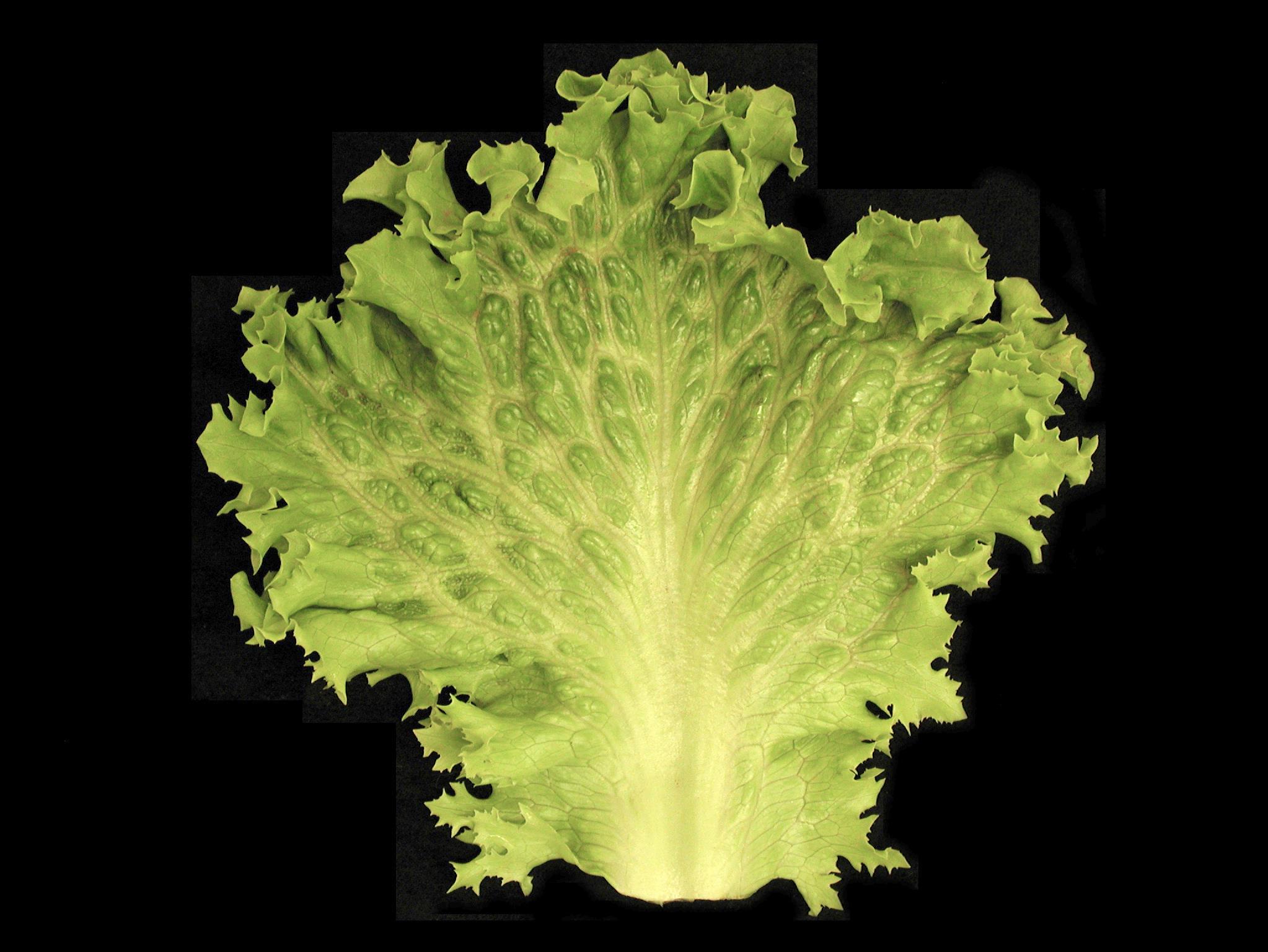 La face supérieure d’une feuille de laitue montre une décoloration suivant les nervures. La feuille est épaisse, cloquée et gaufrée, avec une marge dentelée. Les observations microscopiques ont révélé la présence du champignon Olpidium sp. dans les racines. Ce champignon est vecteur du virus des grosses nervures de la laitue. Les symptômes sont probablement causés par ce virus. Lors de l’analyse de ce cas, le Laboratoire d’expertise et de diagnostic en phytoprotection ne possédait pas l’anticorps pour le détecter.