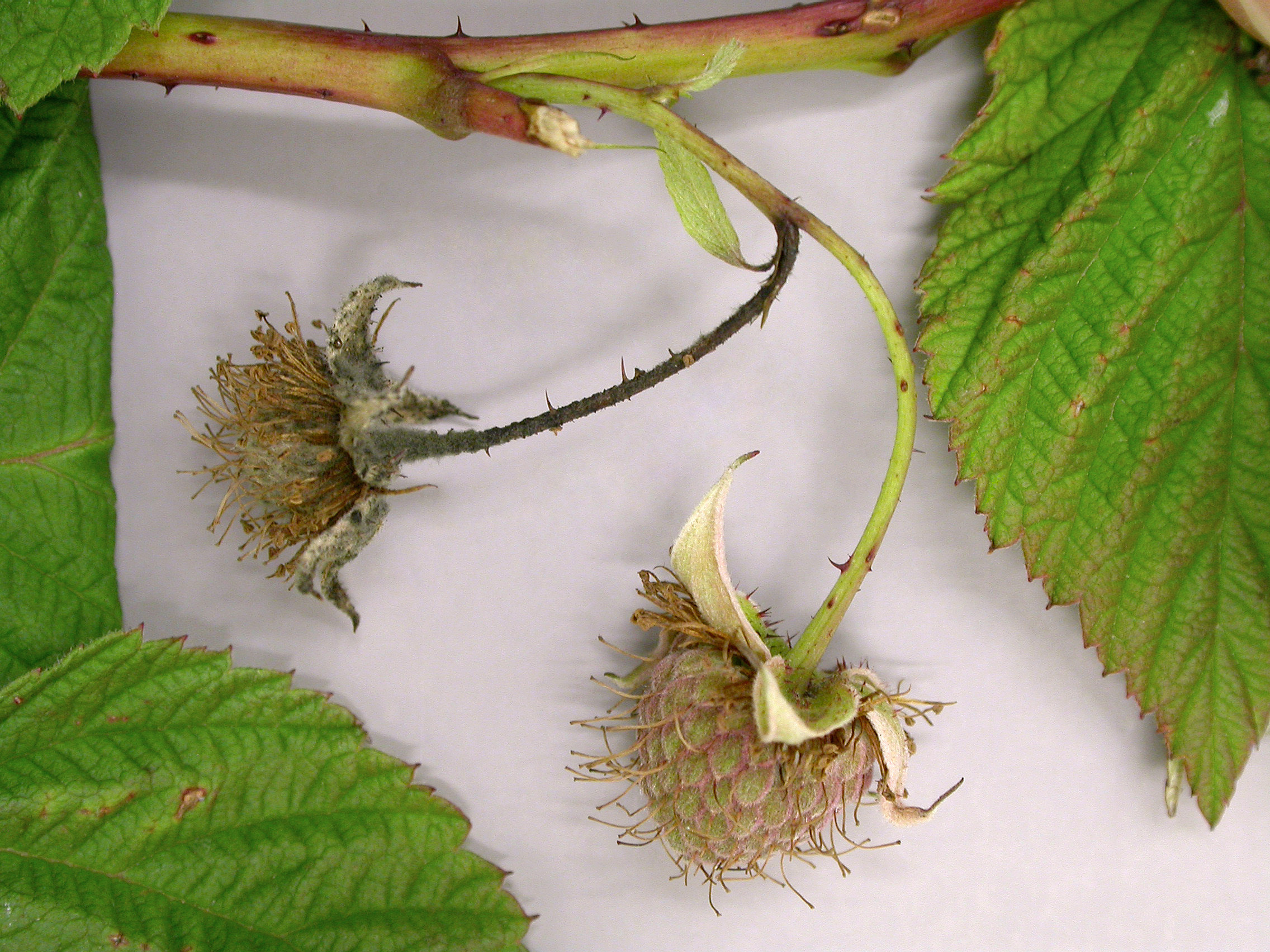 Sur un plant de framboisier (cv 'Nova'), une fleur a avorté et son pétiole est noirci. Elle demeure attachée au plant. Les tests de laboratoire ont révélé la présence de la bactérie Pseudomonas syringae, responsable de la brûlure bactérienne.