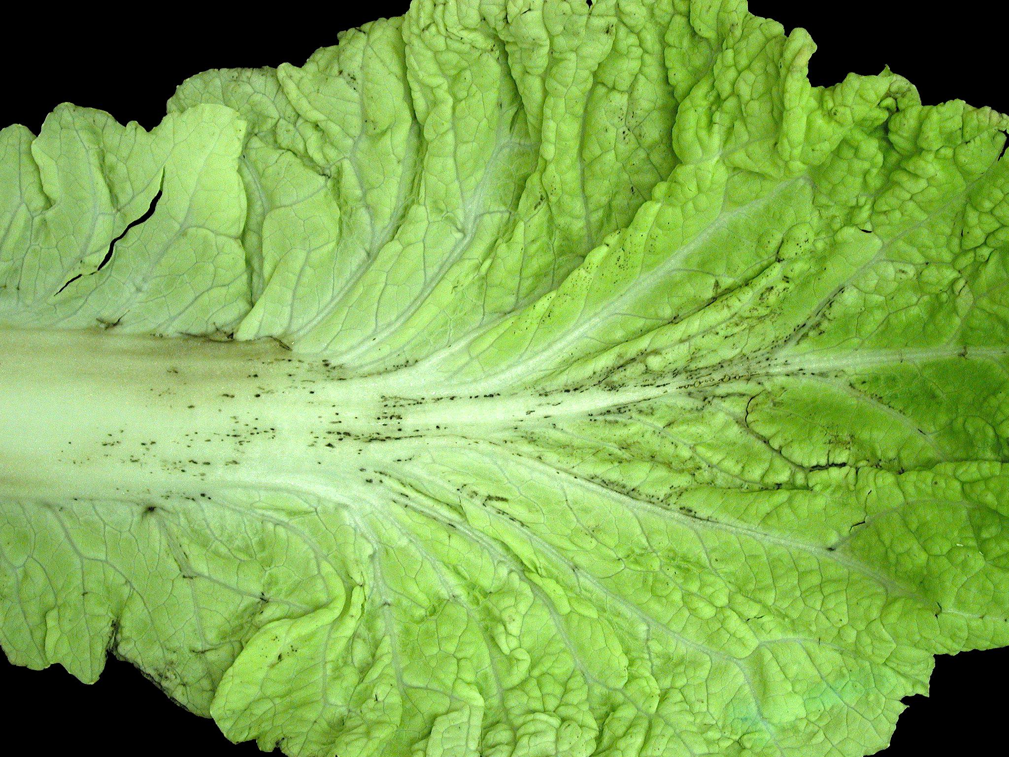 Sur une feuille de chou chinois provenant d’un champ, présences de minuscules taches grises à noires sur le limbe des feuilles basales et médianes. Les taches sont situées près de la marge et entre les nervures, mais à la face supérieure seulement. Elles se regroupent pour former de fines lignes noires, d’une longueur variable (entre 1 et 5 cm), qui longent les nervures secondaires et principales. Les tests de laboratoire ont révélé la présence de la bactérie Pseudomonas syringae. Il s’agit probablement de P. syringae pv. maculicola, responsable de la moucheture bactérienne chez les crucifères. Par contre, il est surprenant que l'infection soit sur un seul côté des feuilles. Il est possible que l'infection ait été favorisée par un film d'eau persistant.