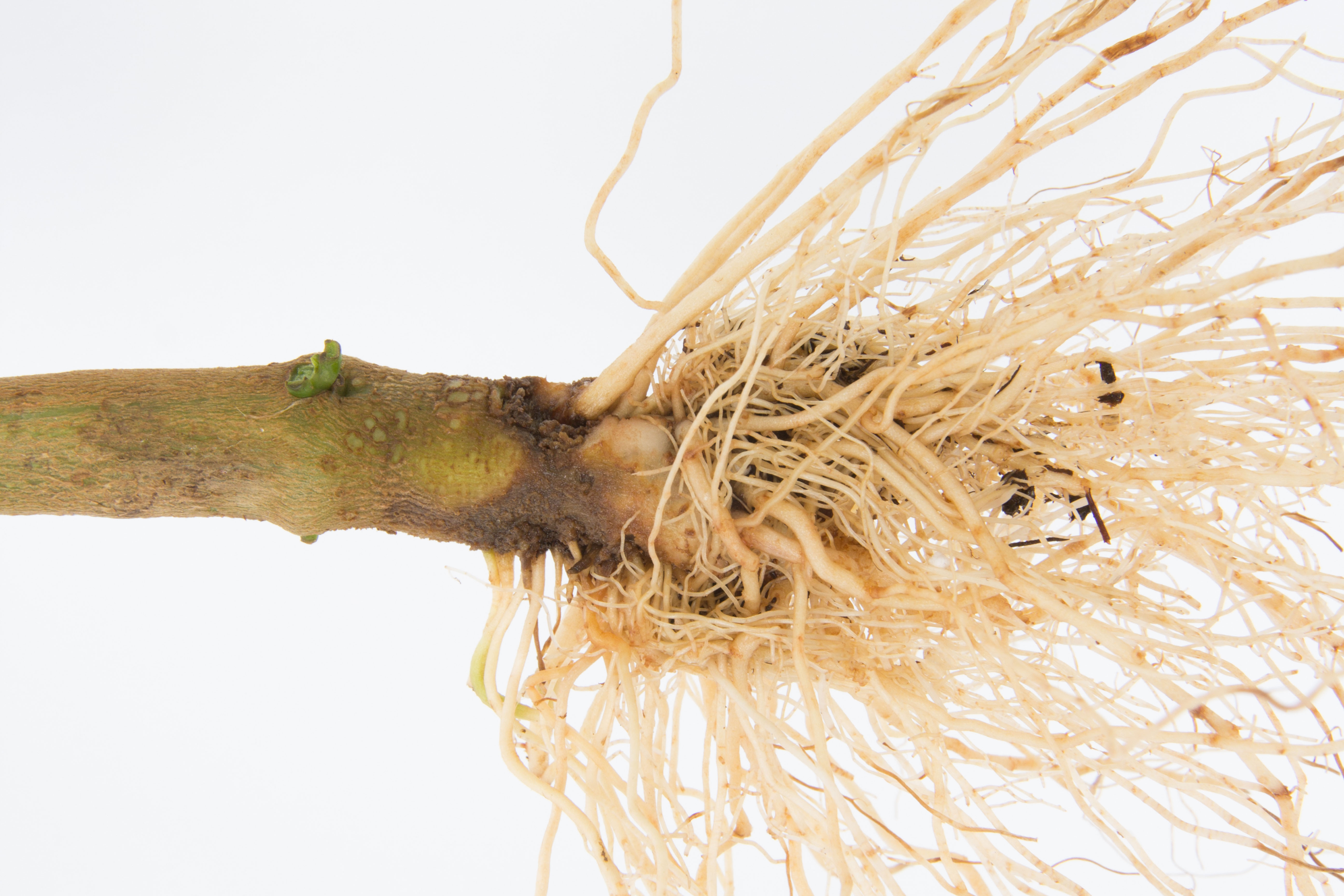 La partie basale de la tige et le collet d’un plant de poivron portent un chancre brun d’une profondeur d’environ 5 mm. Les tissus internes du collet sont pourris et bruns (non visible ici). L’extrémité des racines est légèrement brune. Les jeunes feuilles sont flétries et tombent. Les tests de laboratoire ont révélé la présence de la bactérie Pectobacterium carotovorum dans le collet. Cette bactérie est responsable de la pourriture molle bactérienne chez de nombreuses plantes, dont le poivron. Notez que le champignon Pythium sp. a été isolé des racines brunes. Il est considéré ici comme un agent pathogène secondaire.