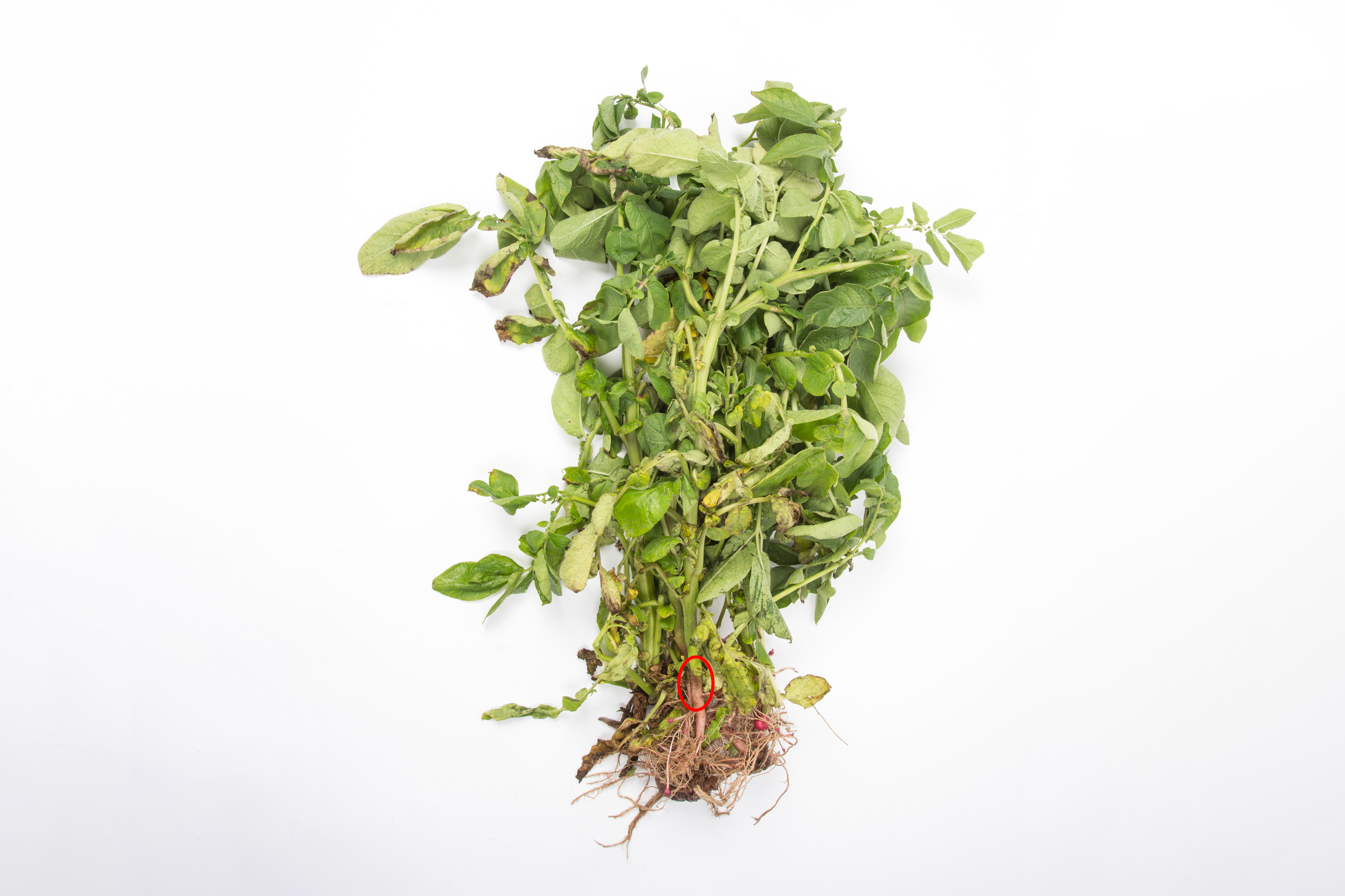 Les feuilles basales d’un plant de pomme de terre (cv 'Chieftain') sont jaunes, flétries et dépéries. À la base de la tige principale, présence d'un chancre noir de grande dimension (voir cercle). La moelle se désintègre dans la région du chancre. Les tissus sont humides et se dégradent. Les tests de laboratoire et de biologie moléculaire (PCR) ont révélé la présence de la bactérie Pectobacterium wasabiae. Cette bactérie fait partie du complexe bactérien causant la jambe noire chez la pomme de terre.