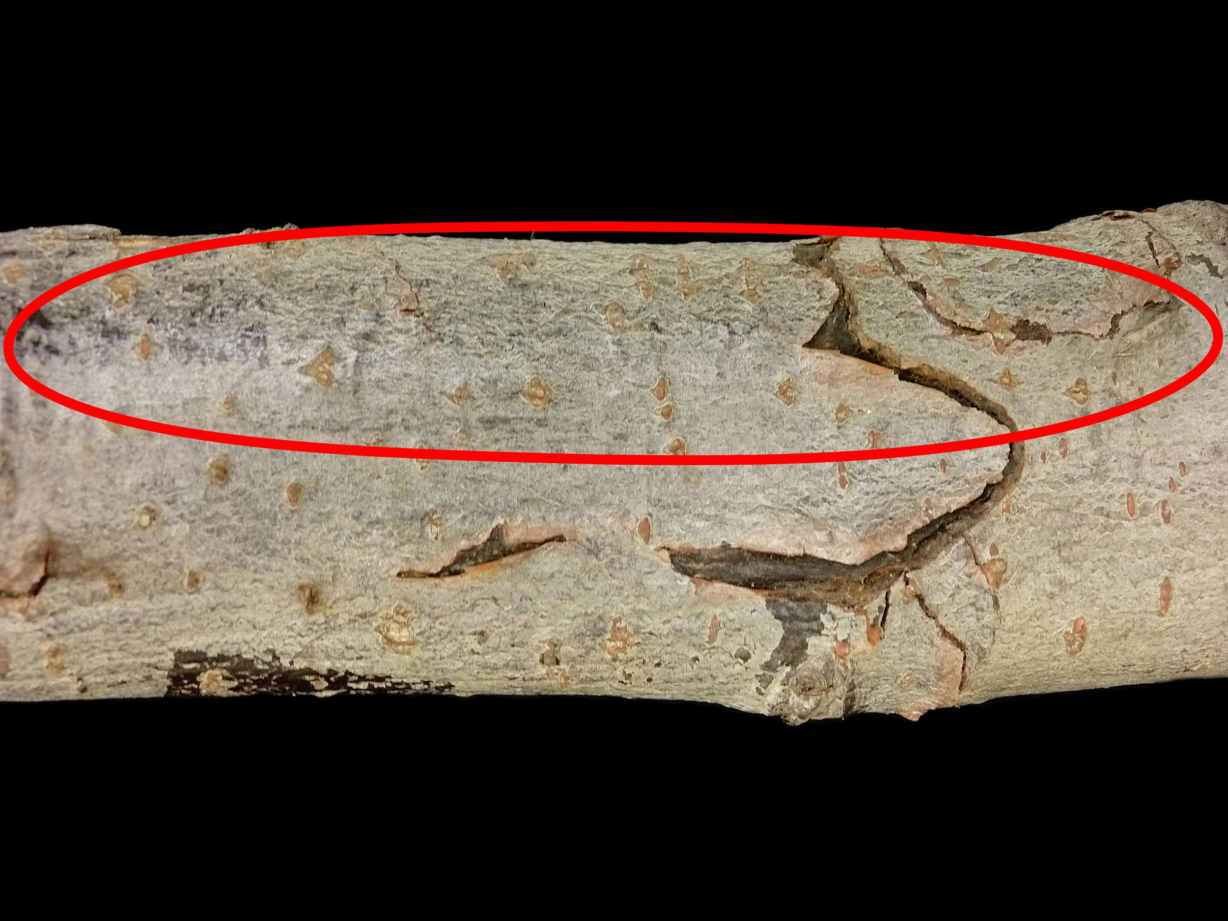 Un tronc de pommier montre un chancre discret noirâtre (voir cercle) sur lequel il y a des zones de fendillement de l’écorce. Le bois est brun sous l’écorce vis-à-vis du chancre (non visible ici). Les tests de laboratoire ont révélé la présence de la bactérie Erwinia amylovora, responsable de la brûlure bactérienne.