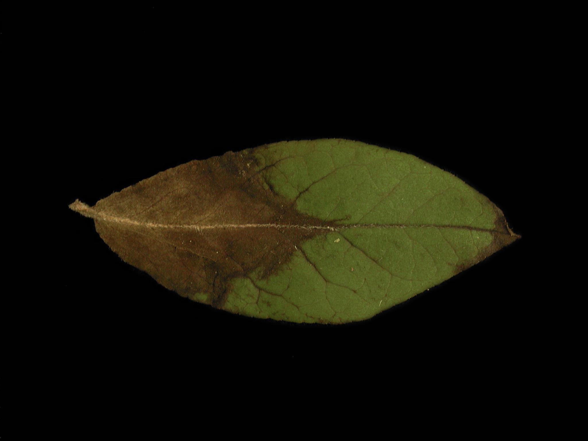 Sur une feuille de bleuet en corymbe, présence d’un brunissement ou d’une brûlure souple du limbe. Le brunissement prend la forme d’un « V » le long des nervures. Les tests de laboratoire ont révélé la présence du champignon Monilinia vaccinii-corymbosi, responsable de la pourriture sclérotique.