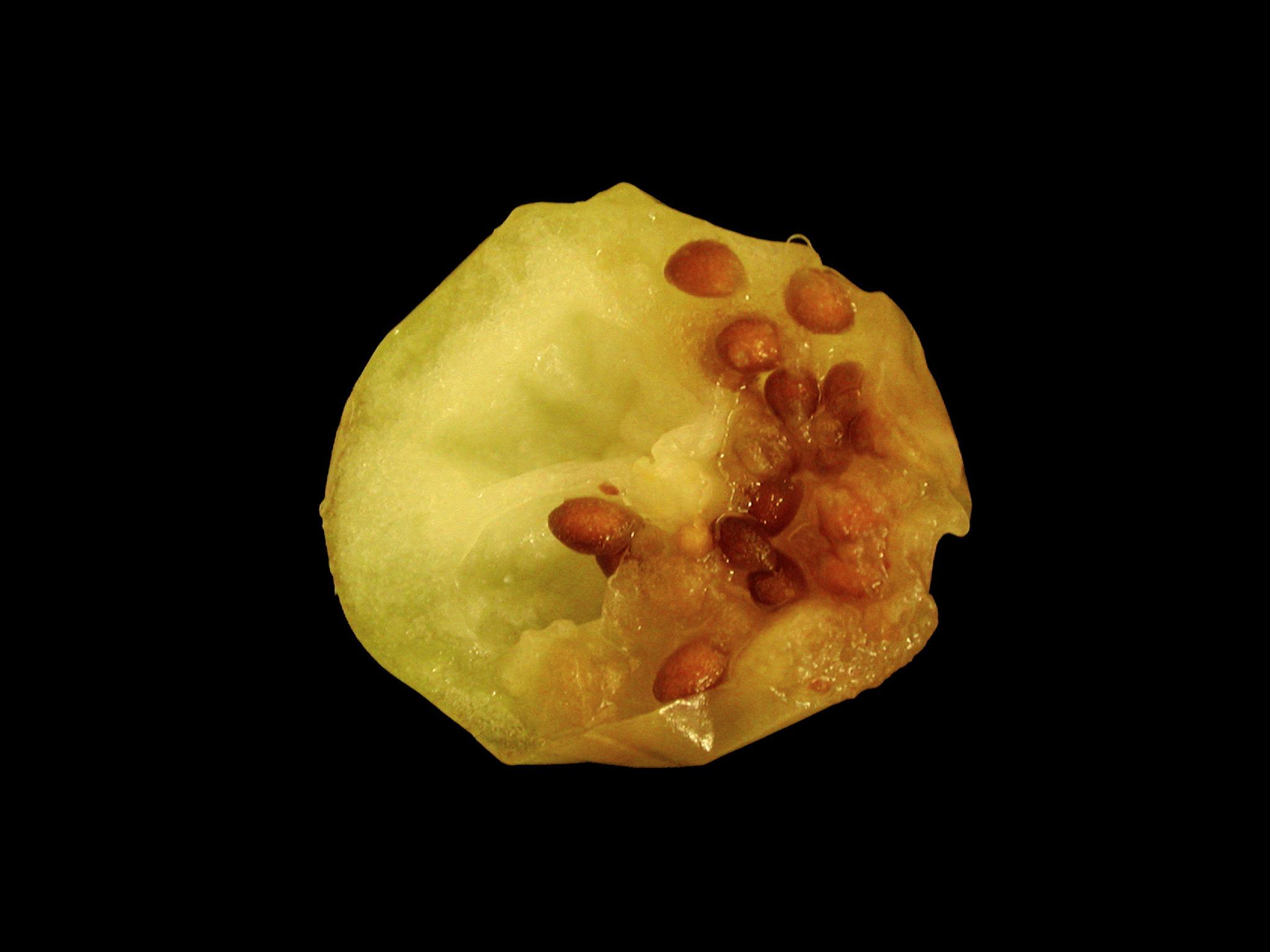 Sur une canneberge, les tissus internes sont mous et bruns. L’épiderme du fruit était brun à orange et translucide. Les tests de laboratoire ont révélé la présence du champignon Coleophoma empetri, responsable de la pourriture des baies chez la canneberge.