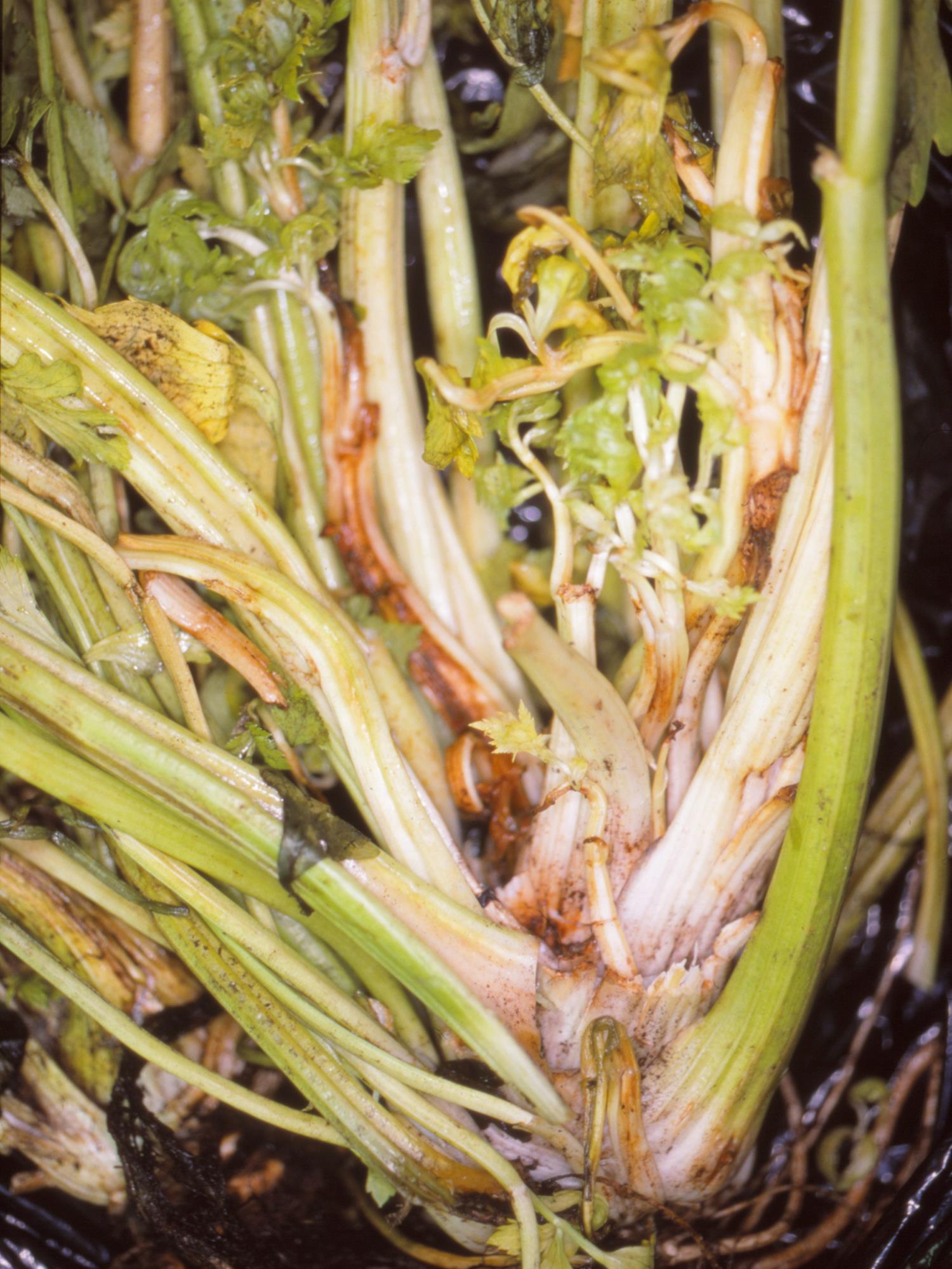 Un plant de céleri (cv 'Colmarion') a été dépouillé de quelques branches pour montrer le cœur. On observe de jeunes feuilles jaunes et tordues. Les pétioles montrent un début de pourriture. Les branches médianes sont blanchâtres avec une teinte rosée à la base. Les feuilles extérieures sont jaunâtres, mais non déformées et les pétioles sont normaux. Les tests de laboratoire ont révélé la présence de phytoplasmes dans les vaisseaux conducteurs des feuilles. Il pourrait s’agir du phytoplasme de la jaunisse de l’aster rapporté chez le céleri.