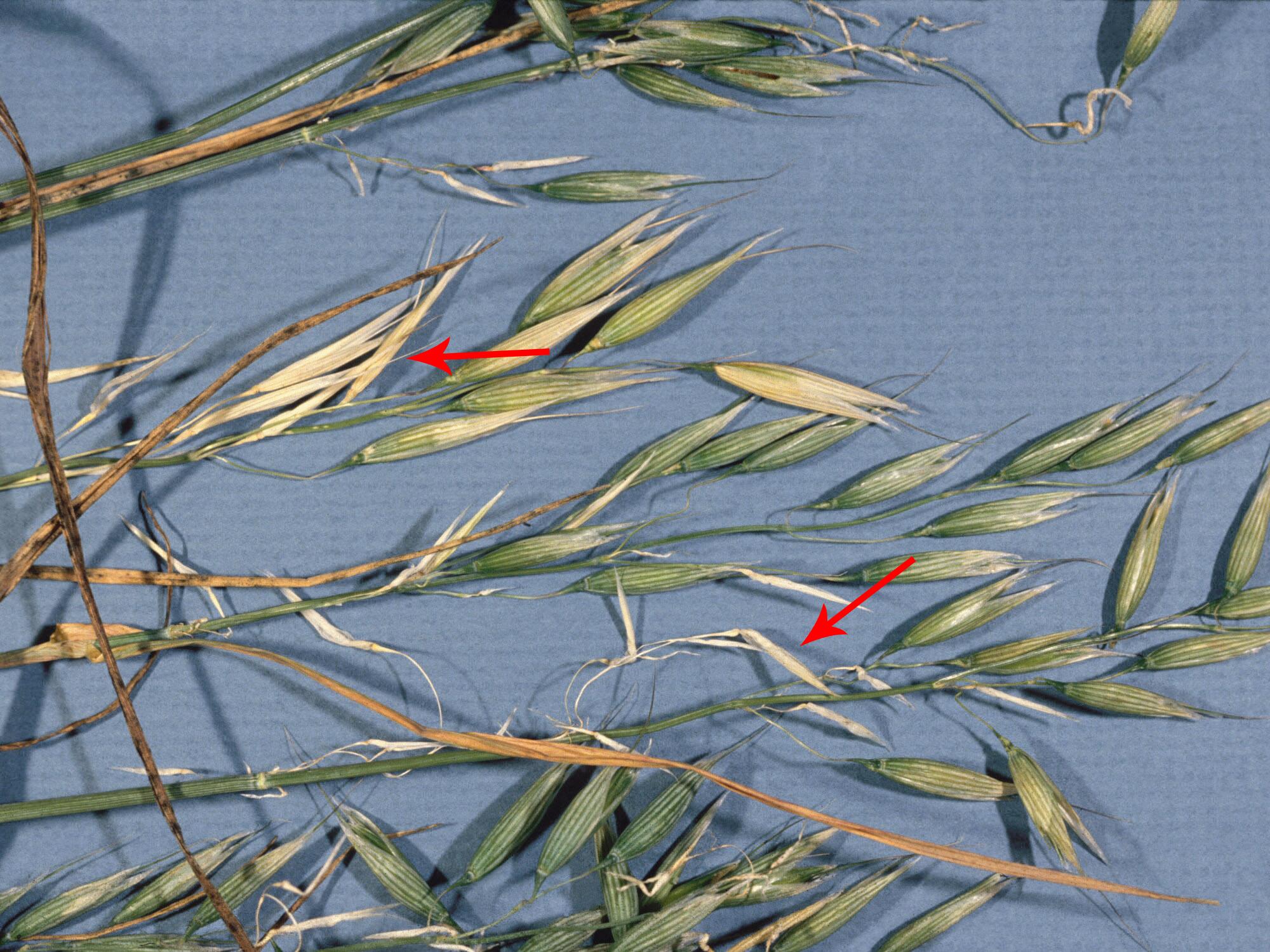 Sur des inflorescences d’avoine ('Woodstock'), avortement et blanchiment de plusieurs fleurs (voir flèches) à la base des panicules. Il ne reste que les glumes. Les stress environnementaux sont responsables de la plupart des avortements (coulure) des fleurs chez l’avoine.