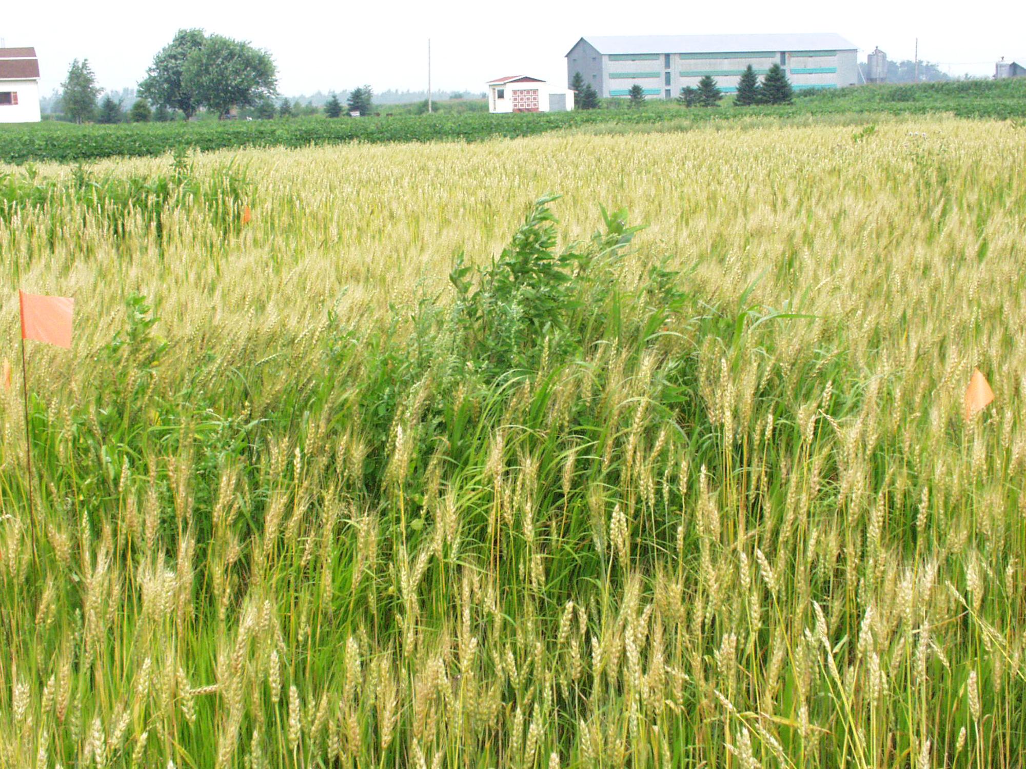 Dans un champ de blé de printemps en production biologique, deux parcelles de plants montrent des plants vert foncé, très feuillés et en retard dans leur développement par rapport au reste du champ. Il y a également une prolifération de mauvaises herbes dans ces zones. Le producteur a fait une application inégale de fumier, appliquant de plus fortes doses dans certaines parties du champ. La coloration vert foncé des plants est attribuable à un excès d’azote.