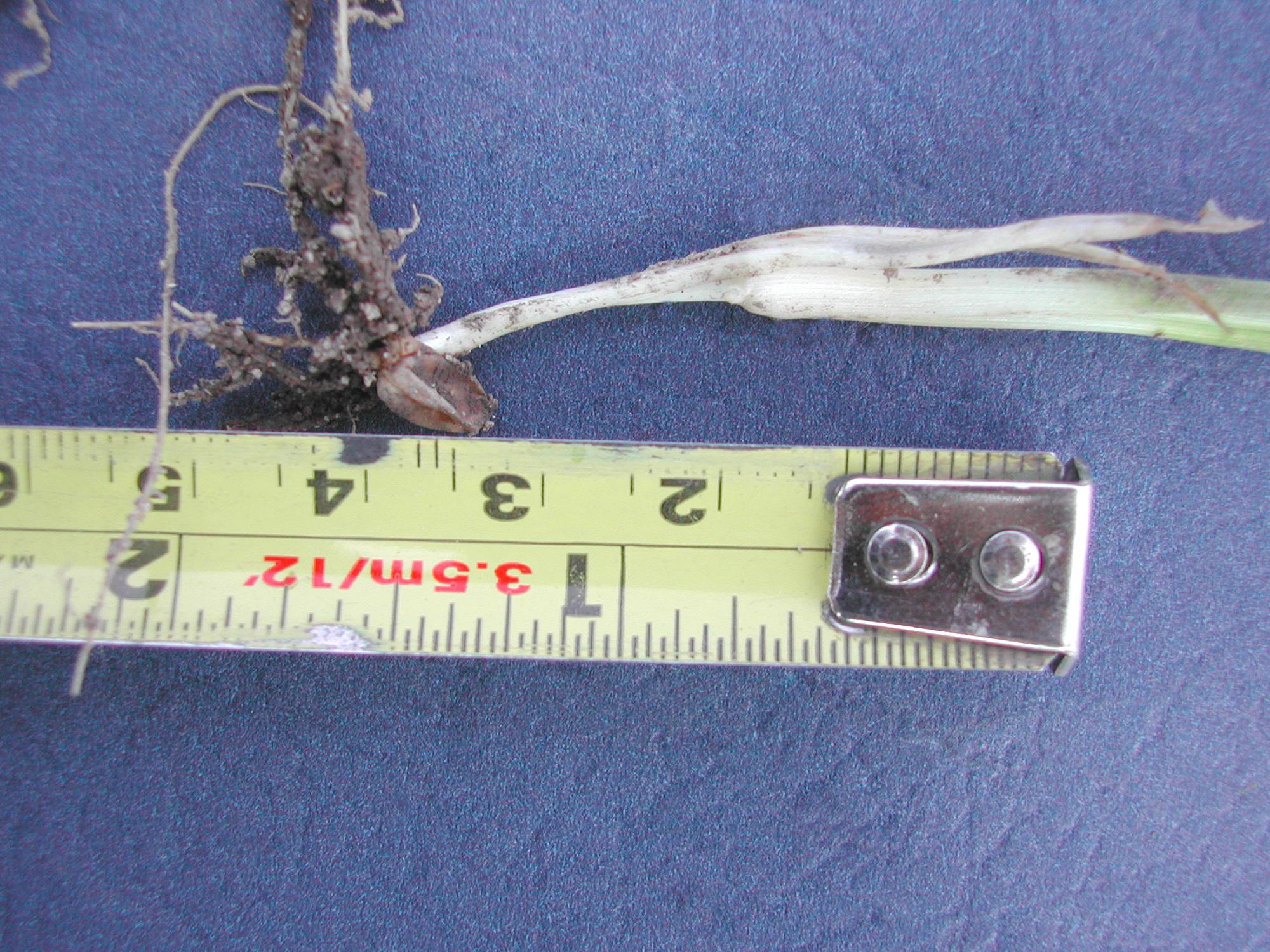 Sur une pousse de blé de printemps, les racines sont faiblement développées et peu ramifiées. Il est impossible de distinguer les racines secondaires (coronales) des racines primaires (séminales). Les racines secondaires devraient se trouver au-dessus des racines séminales alors qu’elles sont absentes ou accolées à la graine. La base de la tige et les premières feuilles sont blanches et chétives. Ces symptômes sont dus à un semis effectué trop profondément (4 cm (1,5 po)).