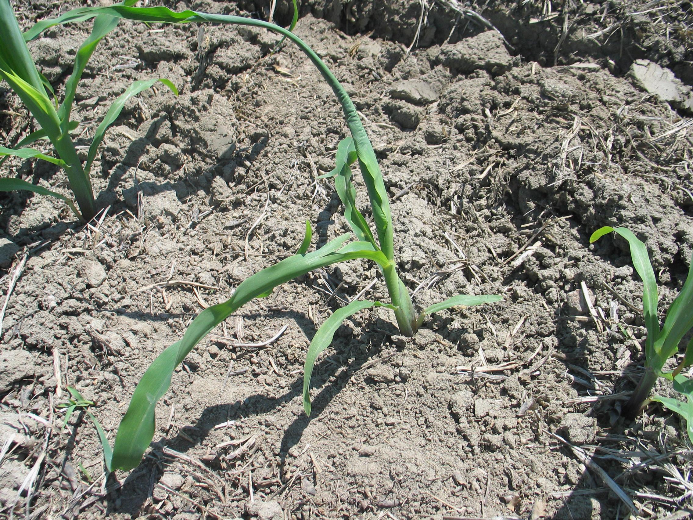 Dans un champ de maïs grain et fourrager en semis direct, les plants montrent des feuilles enroulées. Les racines sont faiblement développées et déformées (non visible ici). Les plants ont subi un grand stress hydrique imputable à un enracinement insuffisant dû au semis fait dans un sol compacté.
