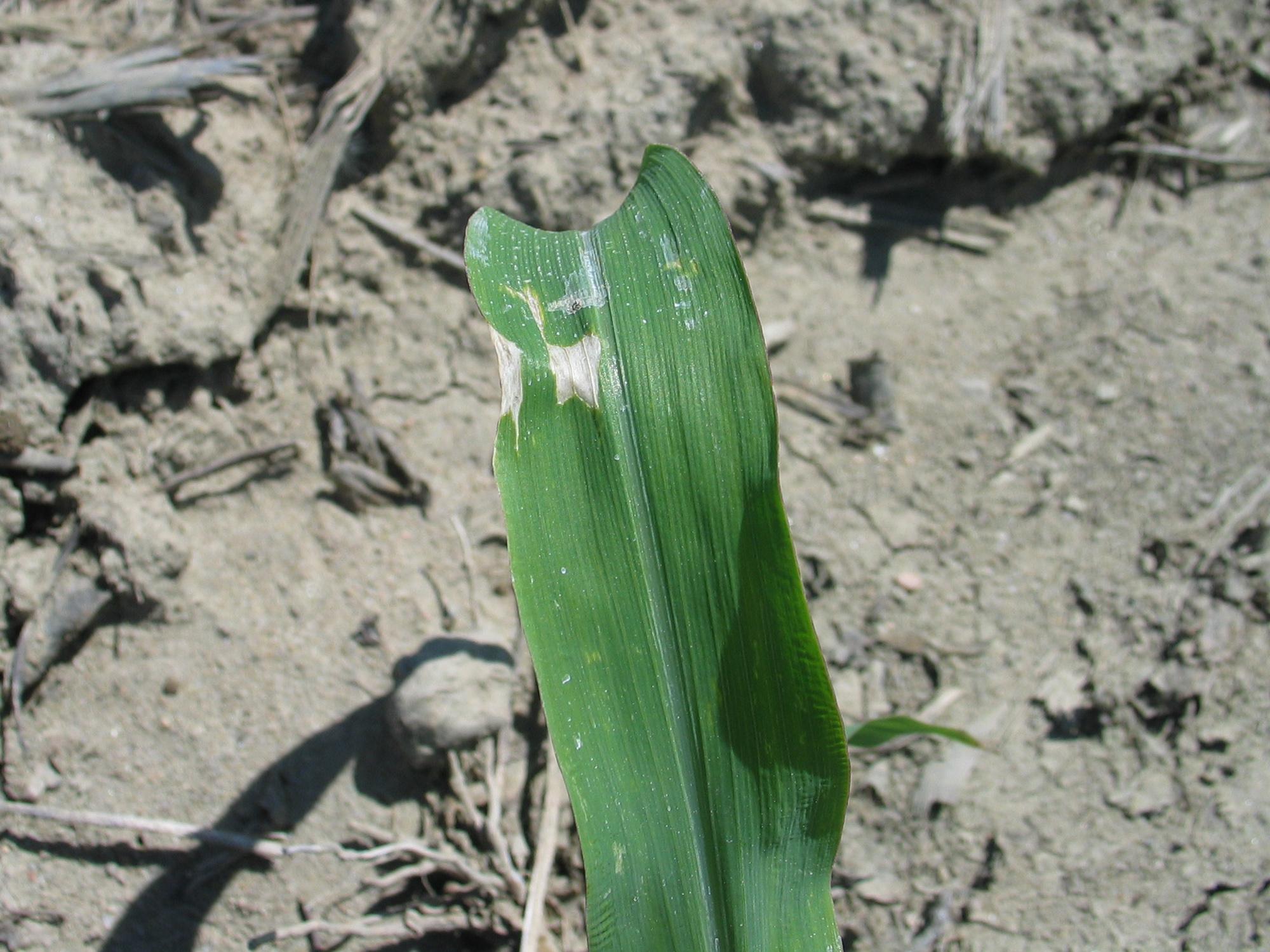 À la face supérieure d’une feuille de maïs grain et fourrager, présence de taches blanches ou de brûlures blanchâtres au point de flexion de la feuille. Chez le maïs, ce symptôme est caractéristique d’une insolation (coup de soleil) survenue après que le froid ait atteint les feuilles au cours de la nuit.