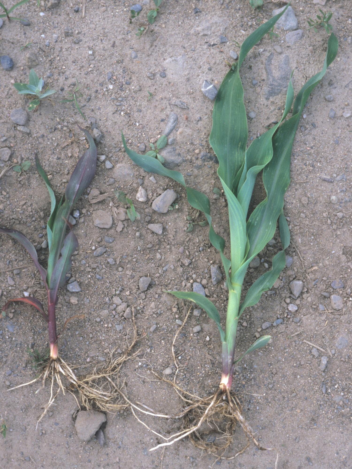 Comparaison entre deux jeunes plants de maïs grain et fourrager. Le plus petit plant (stade 5 à 6 feuilles) montre des feuilles basales et médianes d’une coloration mauve tandis que le plant mieux développé (6 à 7 feuilles) est sans anomalie de coloration. La coloration mauve du feuillage est caractéristique de basses températures de l'air (froid) en début de saison.