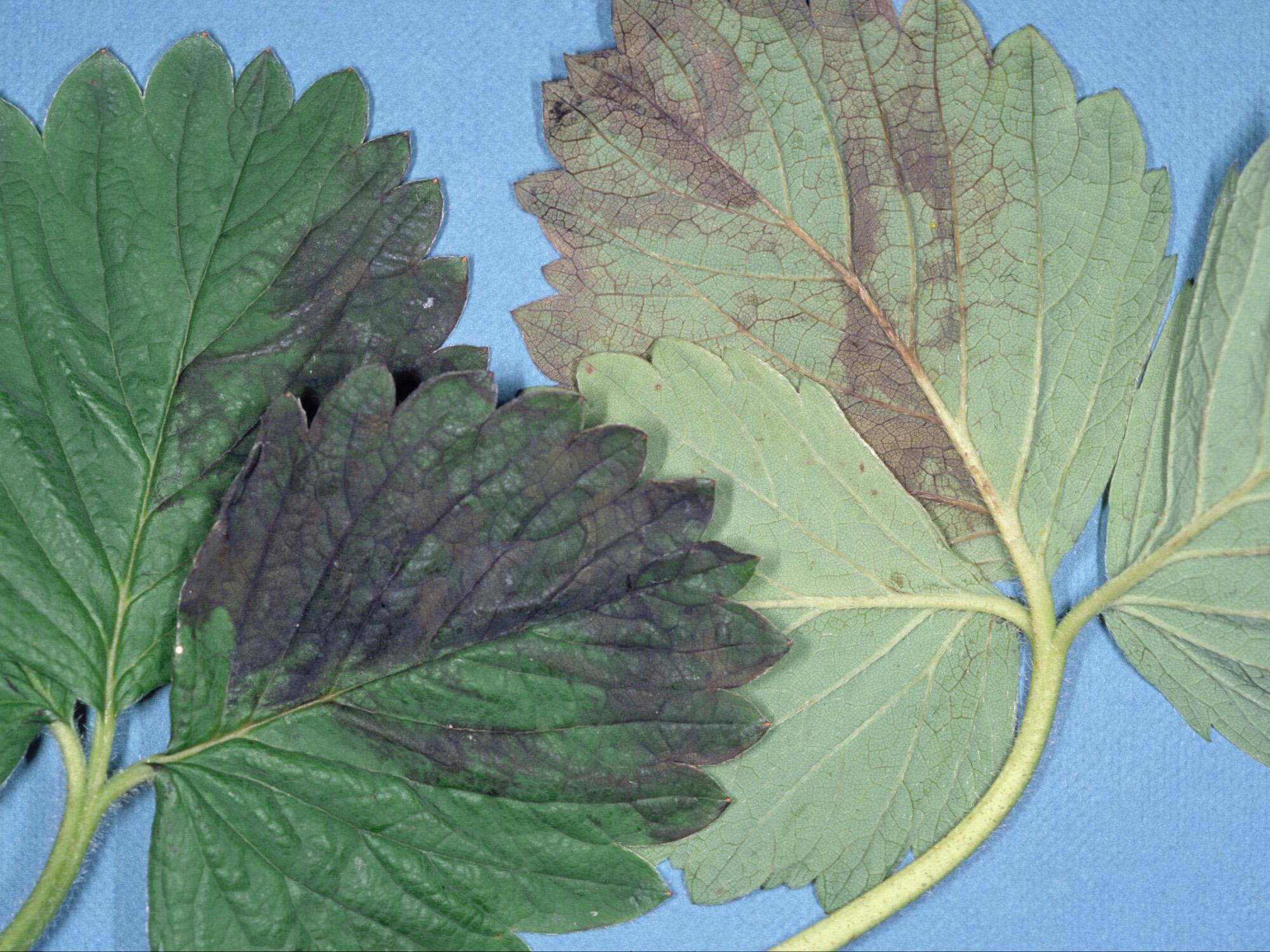 La face inférieure d’une feuille de fraisier montre une coloration bronze tandis qu’à la face supérieure, le limbe est noircit et d’aspect huileux. Les symptômes ne sont pas évolutifs. Ces symptômes sont souvent associés à des blessures de frottement qui surviennent lorsque les vents sont importants.